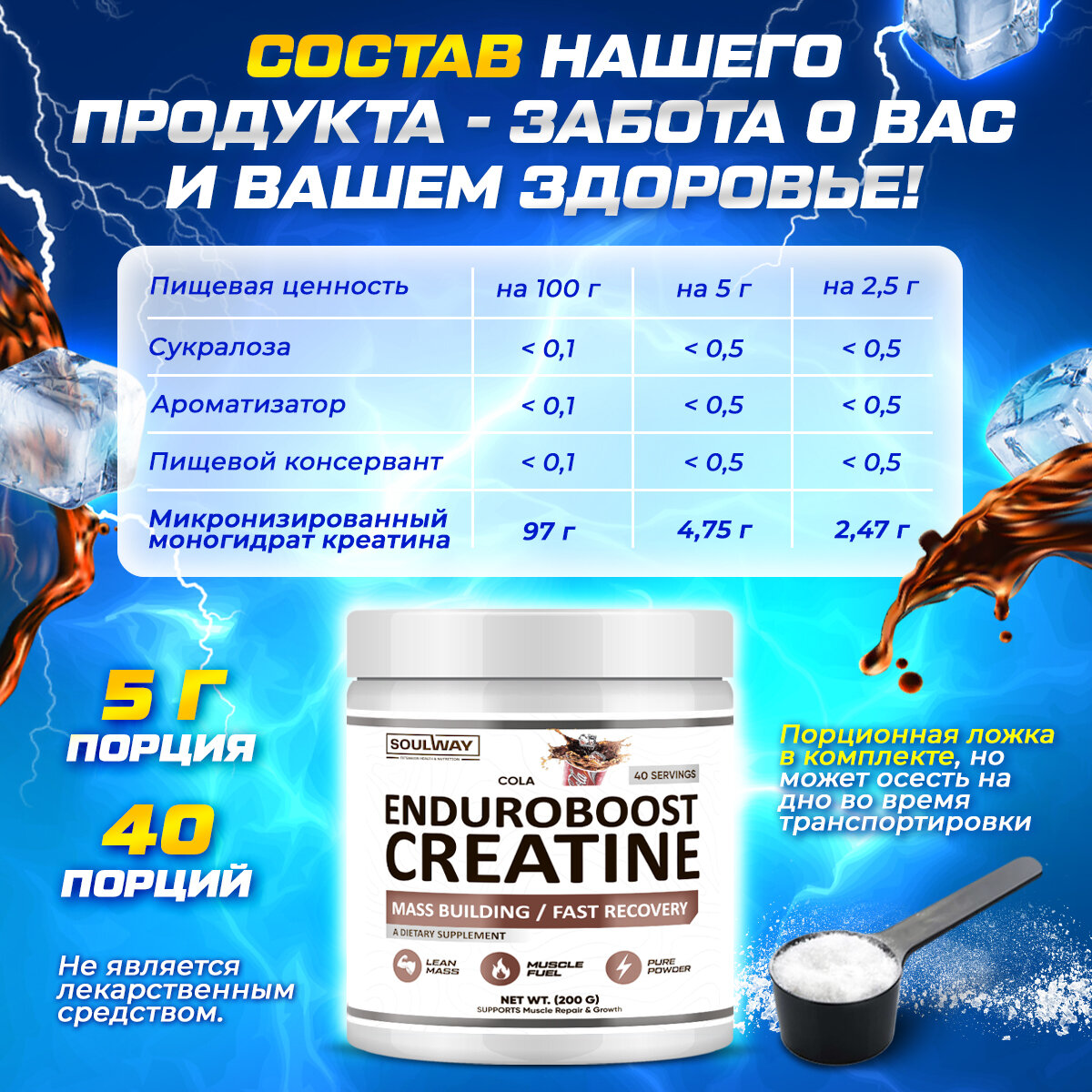 Креатин моногидрат со вкусом колы порошок 200 гр 40 порций, спортивное питание для набора мышечной массы