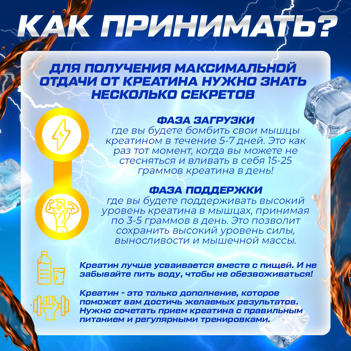 | Дополнительная информация | Описание цикла приема креатина: есть 2 лучших способа приема креатина, с загрузкой и без загрузки. Креатин лучше всего работает с фазой загрузки, за которой следует фаза поддержания – это типичный цикл приема креатина, состоящий из трех частей. Принимайте по 20-30 г в день в зависимости от массы тела в течение 5-7 дней (фаза загрузки), затем принимайте по 5-7 г в день в зависимости от массы тела в течение 3-4 недель (Фаза поддержки). Либо принимайте 1, 2 порции креатина ежедневно на протяжении 3-4 недель (Фаза поддержки) равномерным фоном. |