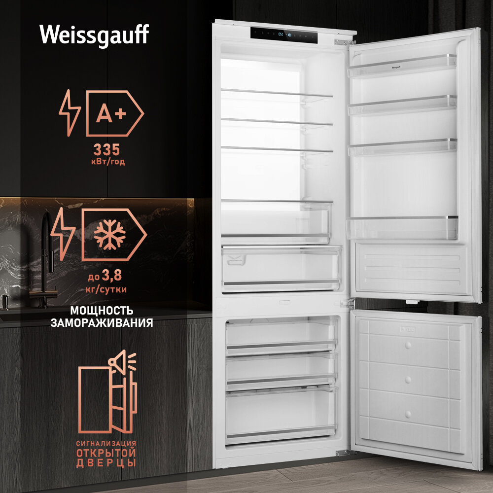 Встраиваемый холодильник с инвертором Weissgauff WRKI 1969 Total NoFrost Premium BioFresh двухкамерный, 3 года гарантии, высота 193 см, ширина 69 см, объем 341 л, электронное управление, суперзаморозка, суперохлаждение, LED-освещение