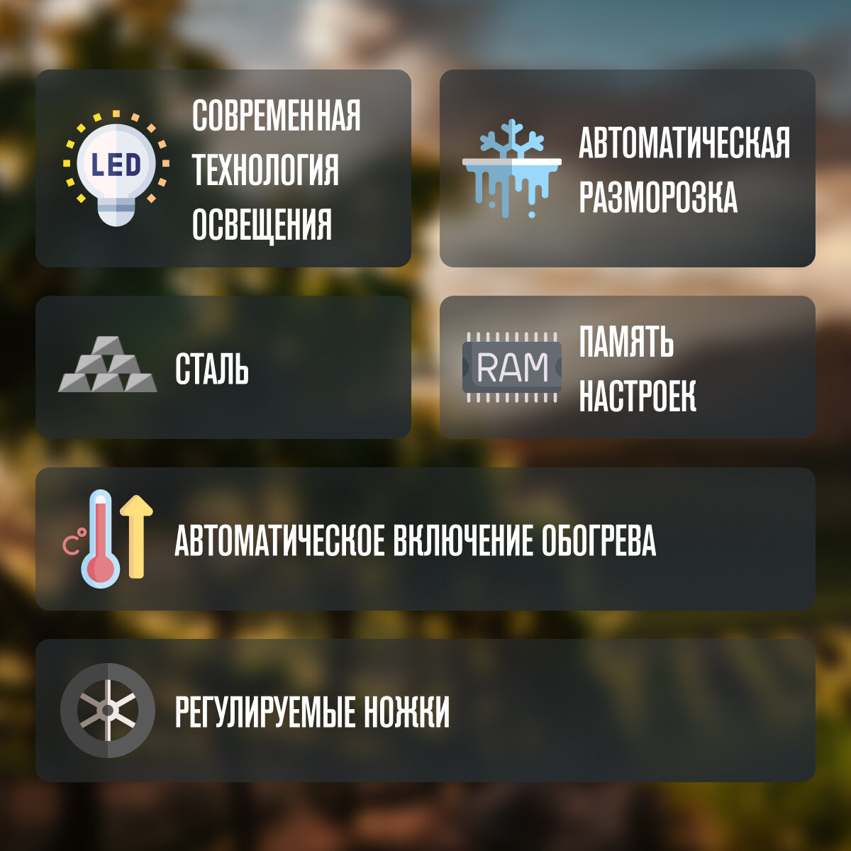 | Дополнительная информация | Панорамное освещение, Угольный фильтр, Сигнализация открытой двери, Сигнализация отклонения температуры, Зимний режим, Блокировка панели управления, Режим Эко Демо, Память настроек, Регулируемые ножки, Углублённый цоколь |