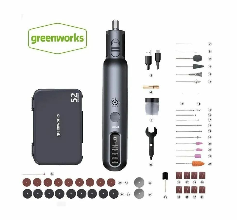 Высокотехнологичный беспроводный гравер Greenworks с набором 52 шт. 6 режимами 5-30 тыс. об./мин. - 80 Вт - 8 В - литиевая батарея 1000мАч