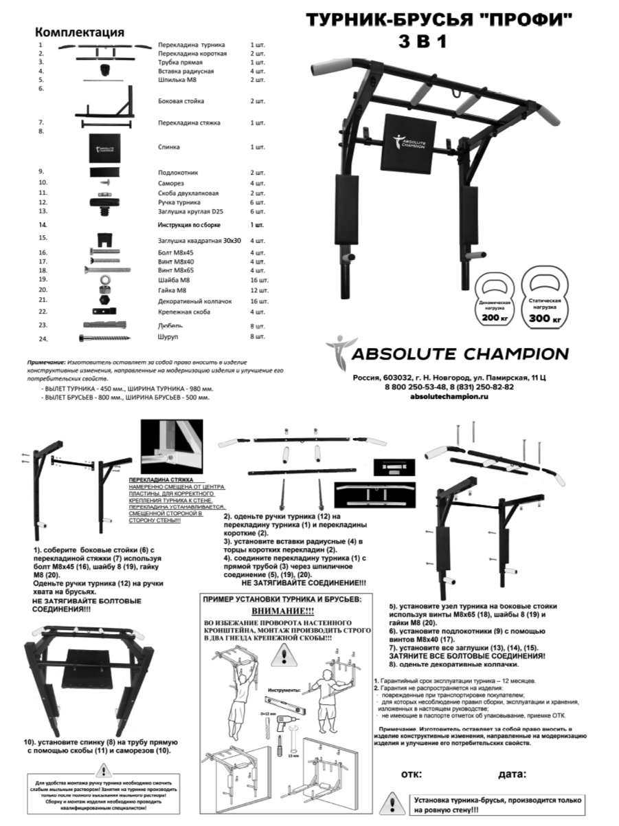 | Дополнительная информация | Комплектация: перекладина турника-1шт, перекладина короткая-2шт, трубка прямая-1шт, вставка радиусная-4шт,; шпилька М8-2шт, боковая стойка-2шт, перекладина стяжка-1шт, спинка-1шт; подлокотник-2шт, саморез-4шт, скоба двухлапковая-2шт, ручка турника-6шт,; заглушка круглая D25-6шт, заглушка круглая D38-2шт, заглушка квадратная-4шт,; декоративный колпачок-16шт, крепежная скоба-4шт, дюбель-8шт, шуруп-8шт, |