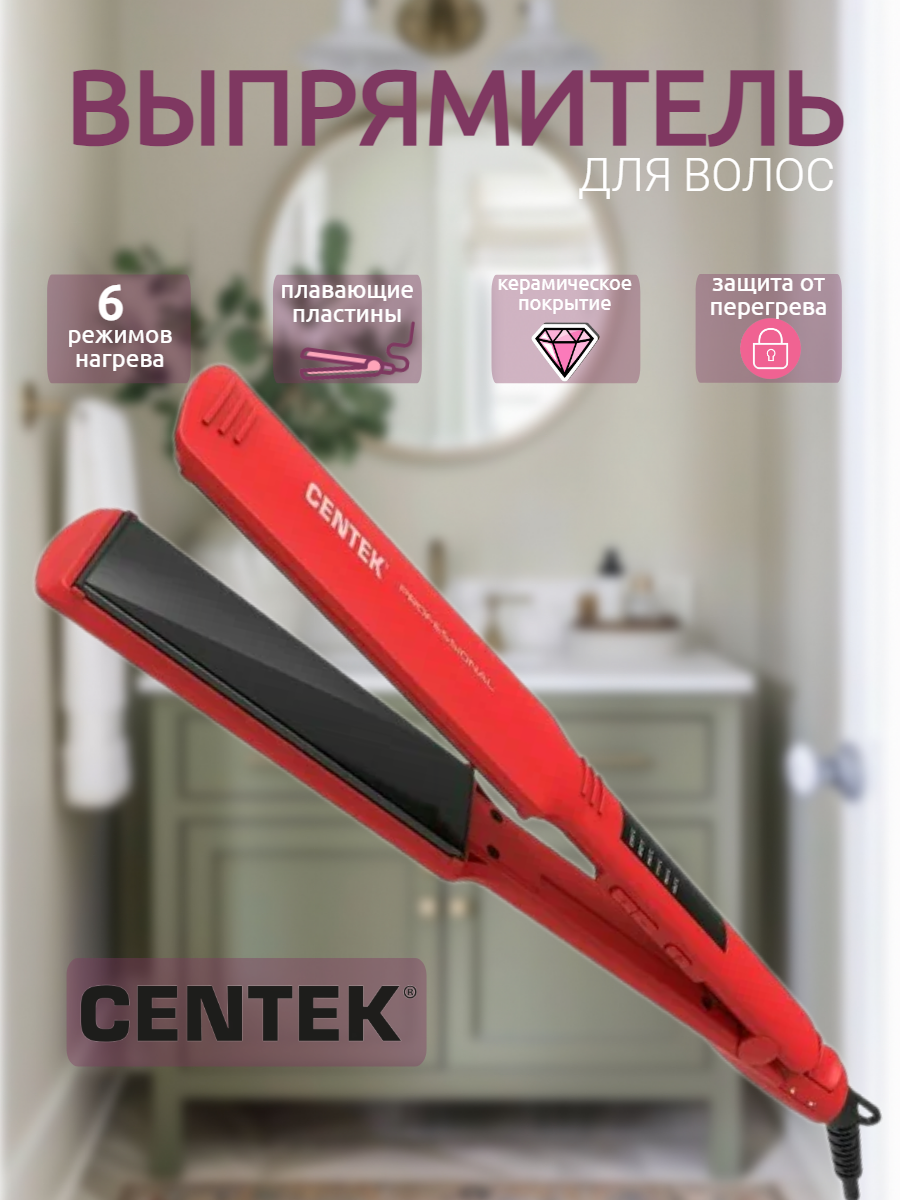 Купить Выпрямитель для волос с широкими плавающими пластинами Centek CT-2031 RED 60Вт, 120x44 мм, LED, ультратонкий дизайн, автовыключение