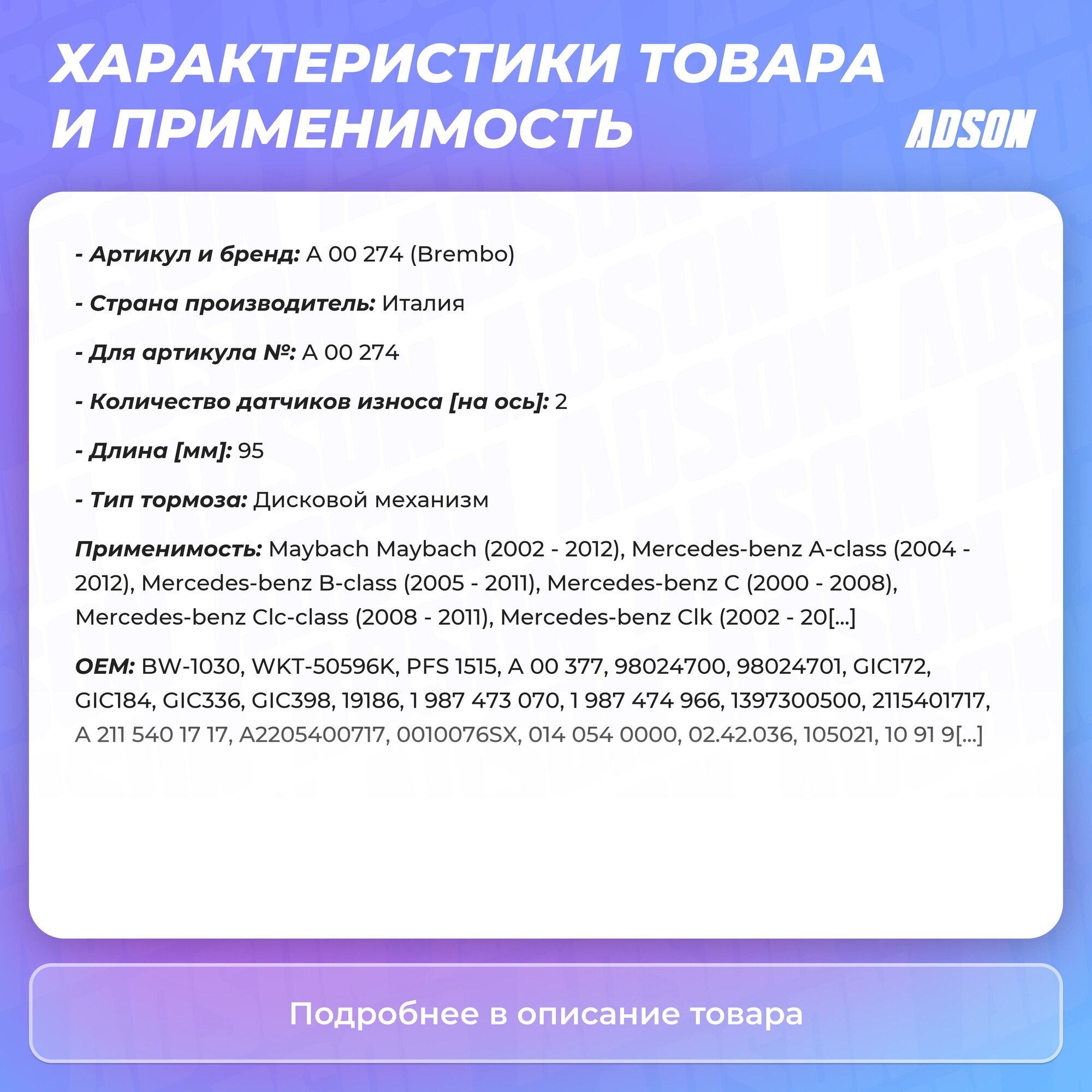 BREMBO A00274 Датчик износа колодок MERCEDES C-CLASS W203 C 180 203.035 2000/10-2002=>