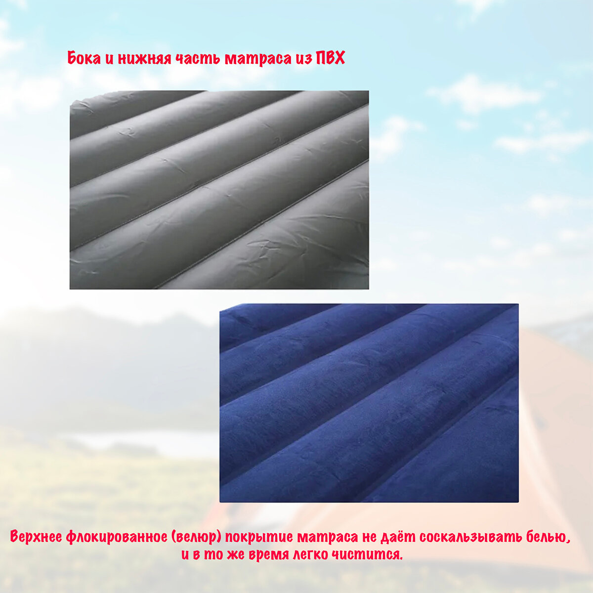 | Плюсы: | Отличный матрац! Ничего не не сдувается, прочный! Брал для вылазок с палатками, временно (месяц) использую в качестве кровати на двоих! Иногда барахтаемся на нем с детьми! В комплекте 2 подушки и насос. |