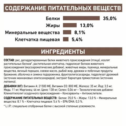 | Пищевая ценность | белки 35%, жиры 13 %, минеральные вещества 8.1 %, клетчатка пищевая 5.4 %, EPA/DHA 0.3 % |
