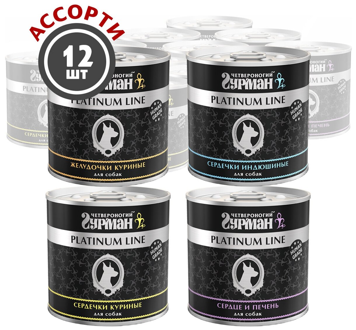 Корм консервированный для собак Четвероногий Гурман "Platinum line микс №1 из 4 вкусов (Жел кур, Серд инд, Серд кур, Серд и печ)", 240 г х 12 шт.