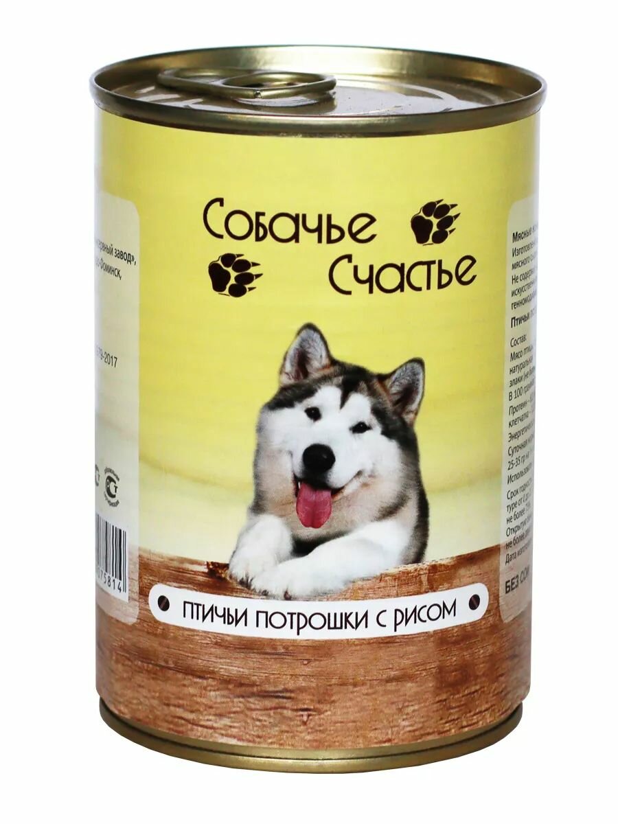 Собачье счастье Консервированный корм для собак Птичьи потрошки с рисом 410г (2 шт)