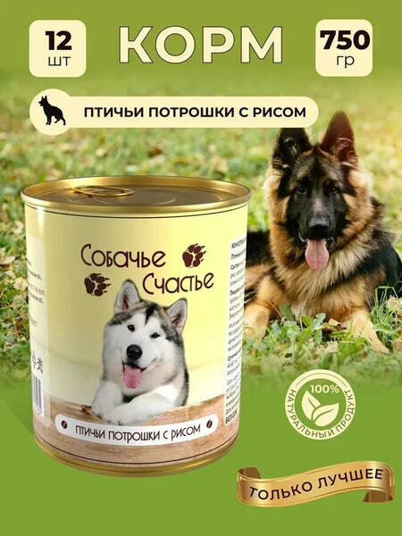 Собачье Счастье влажный корм для взрослых собак всех пород, птичьи потрошки и рис 750 гр