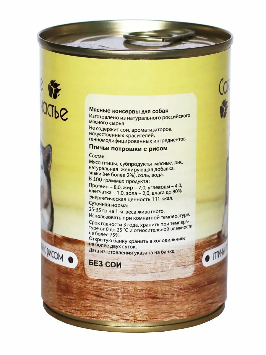 Консервированный корм для собак, Собачье Счастье, птичьи потрошки с рисом, 410 г, 1 шт.
