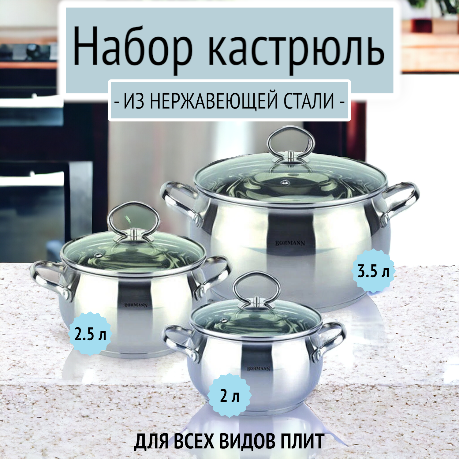 Набор кастрюль из нержавеющей стали Bohmann, 2 л, 2.5 л, 3.5 л, BH-0601