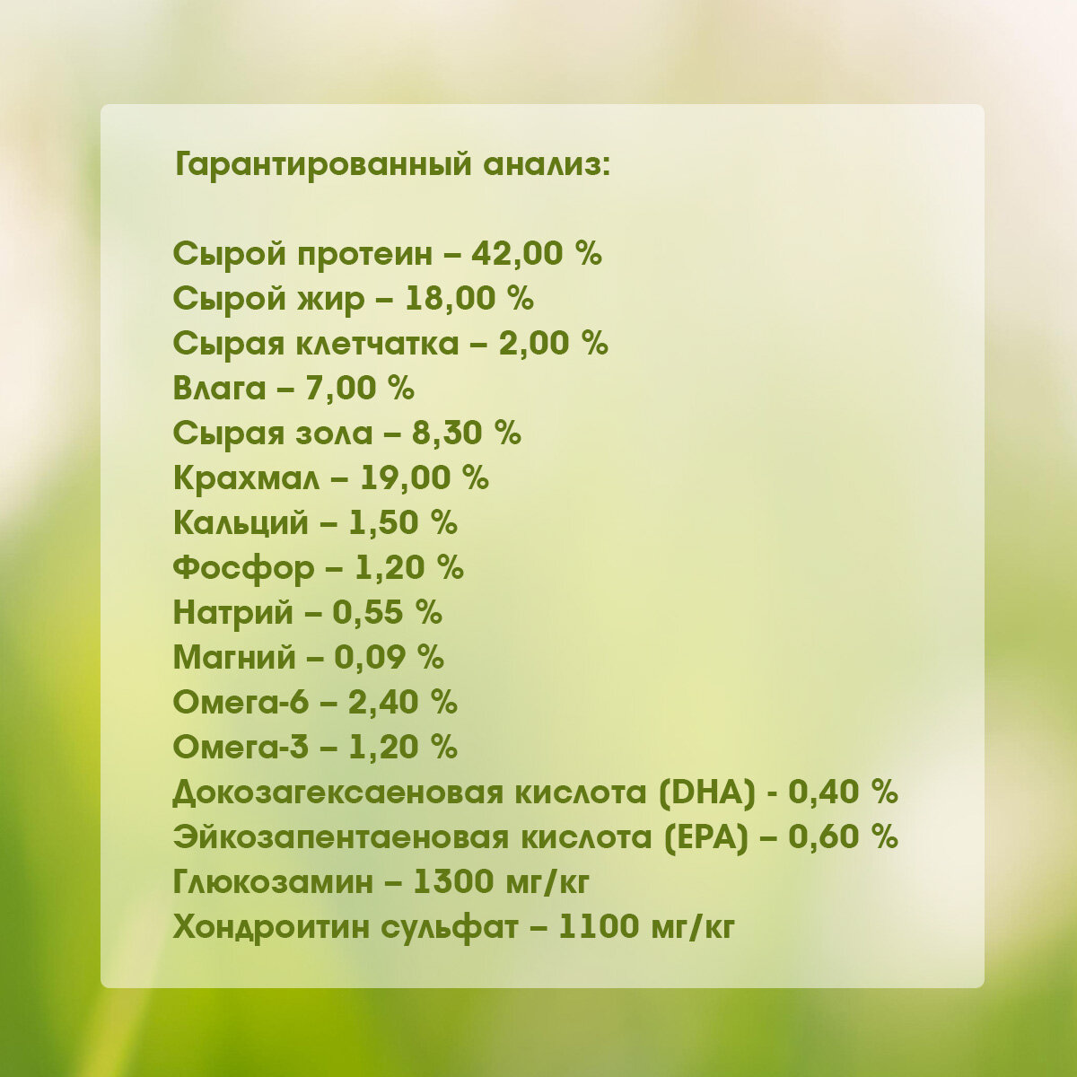 | Пищевая ценность | сырой протеин – 42,00%, сырой жир – 18,00%, сырая клетчатка – 2,00%, влага – 7,00%, сырая зола – 8,30%, крахмал – 19,00%, кальций – 1,70%, фосфор – 1,30%, натрий – 0,55%, магний - 0,09%; Омега-6 – 2,40%, Омега-3 – 1,20%, докозагексаеновая кислота (DHA) - 0,40%, эйкозапентаеновая кислота (EPA) - 0,60%, глюкозамин – 1300 мг/кг, хондроитин сульфат – 1100 мг/кг |