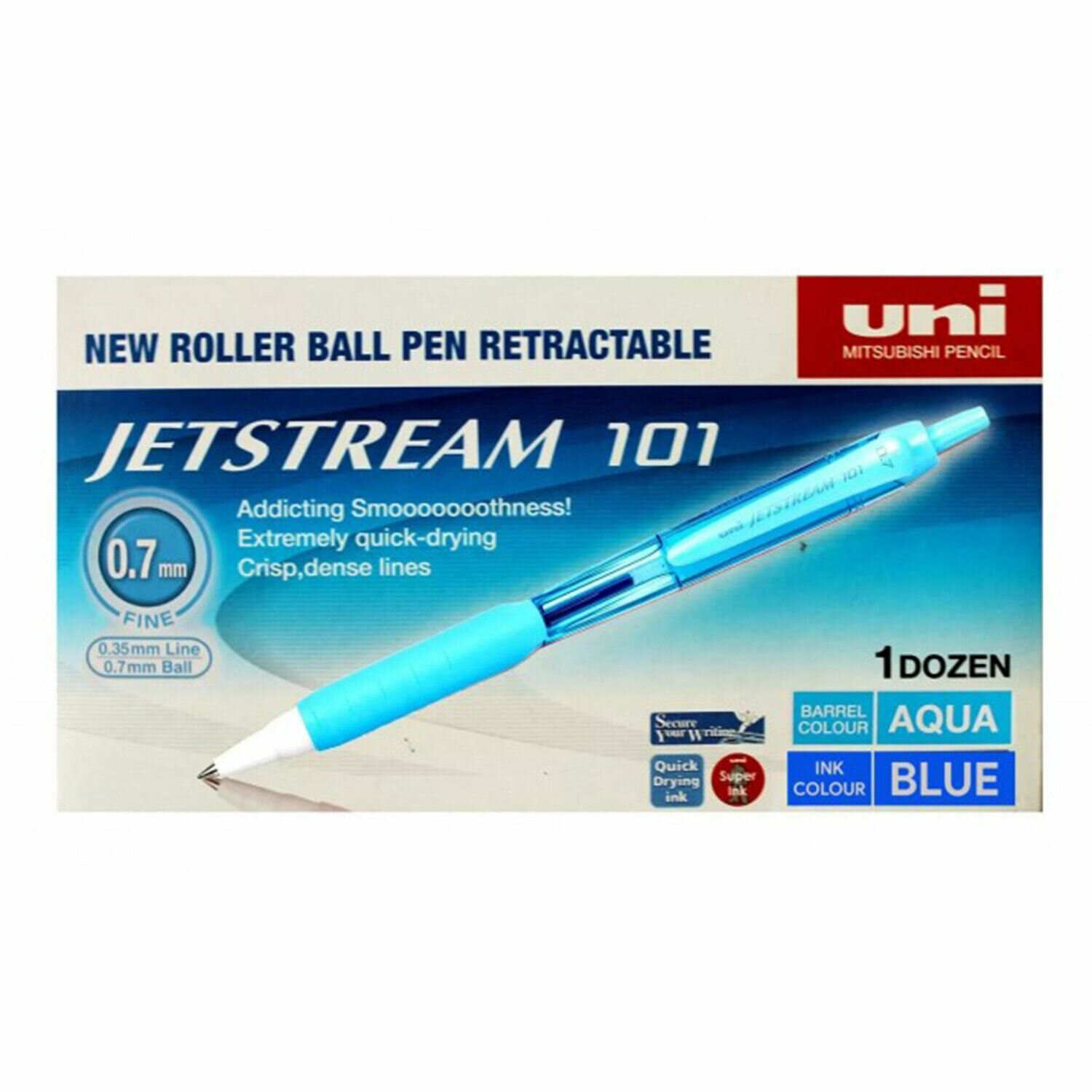 Комплект 12 шт, Ручка шариковая автоматическая Uni "Jetstream SXN-101-07FL" синяя, 0.7мм, грип, бирюзовый корпус