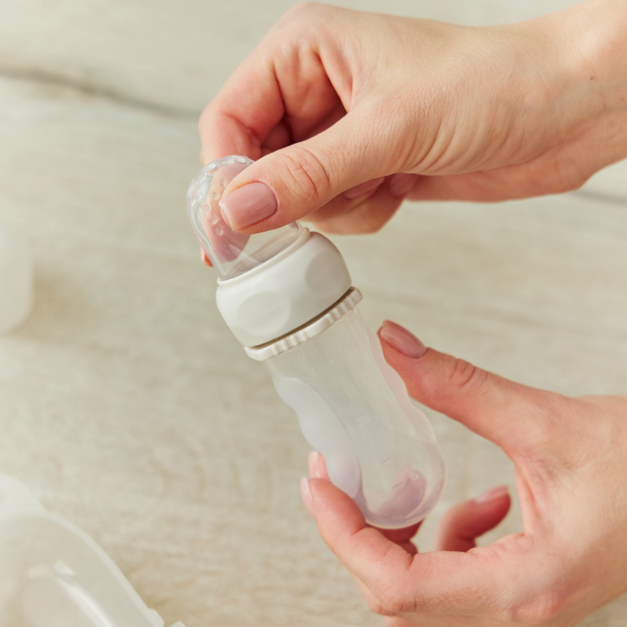 15057, Ниблер-дозатор Happy Baby, ниблер для прикорма, силиконовый, с мерным делением, в футляре, кремовый