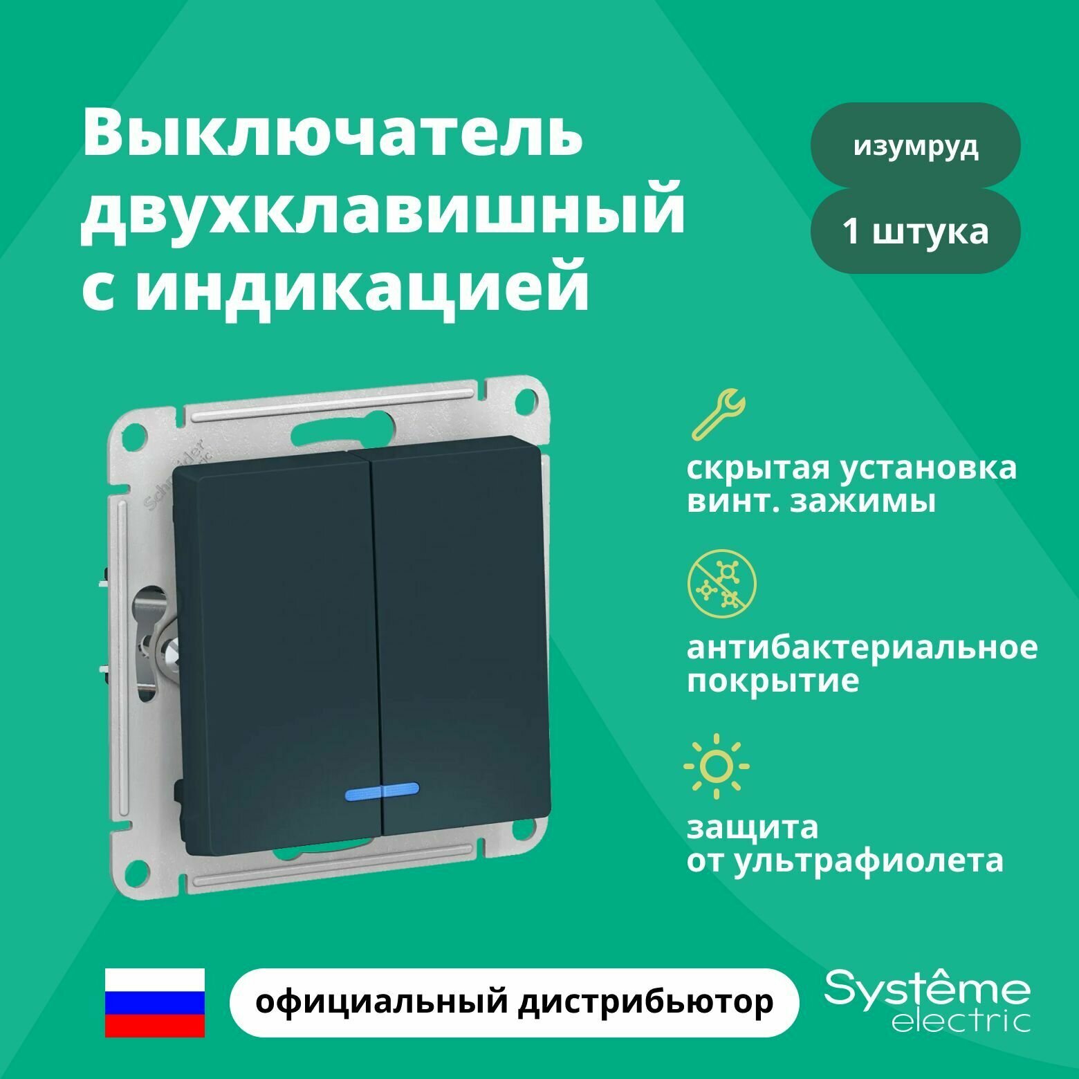 СохранитьВыключатель 2-клавишный Systeme Electric AtlasDesign с подсветкой, скрытый монтаж, изумруд , ATN000853 интересное: