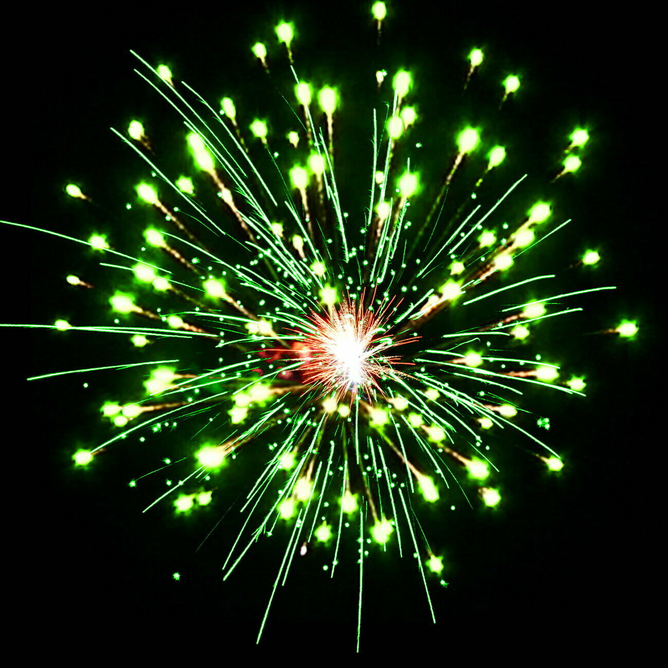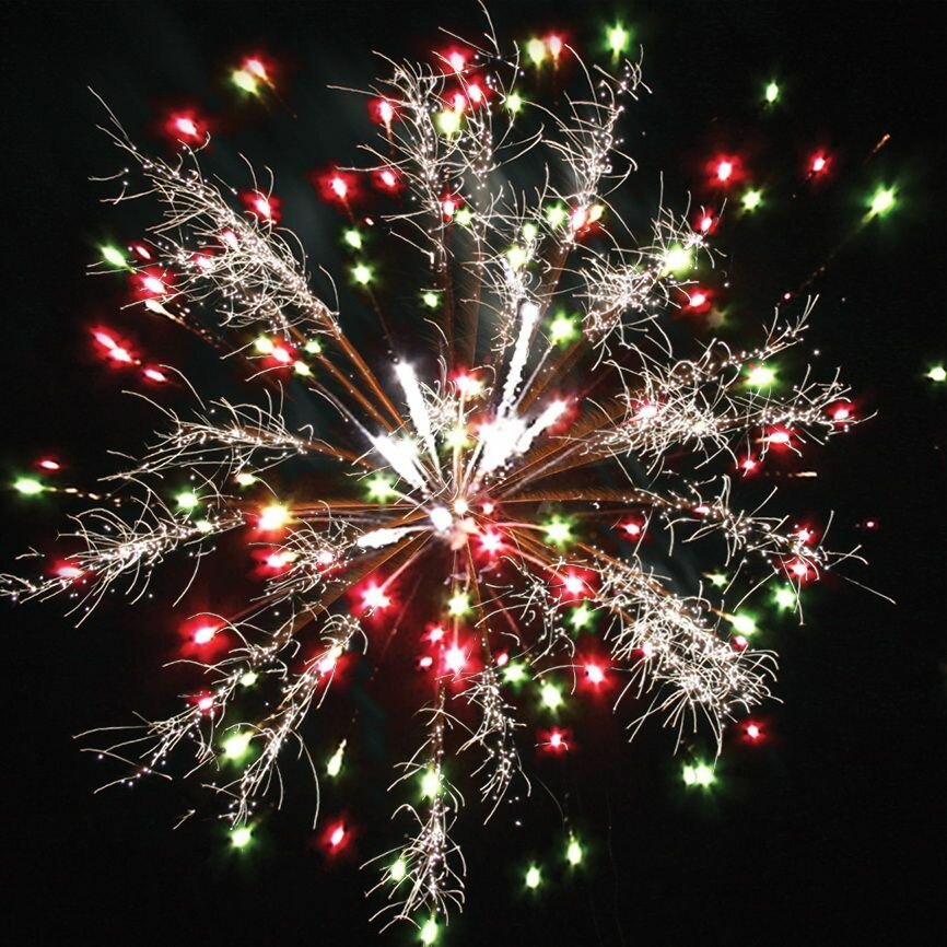 | Эффекты | Эффекты: 1. Разноцветные кометы разрываются сферами. 2. Серебряные форсы / красные и зеленые мерцающие огни. 3. Золотые форсы / зеленые и золотые мерцающие огни. 4. Зеленые огни. 5. Золотые форсы / красные и золотые мерцающие огни. 6. Золотые искристые форсы и красные огни. 7. Золотые искристые форсы и зеленые огни. 8. Красные / зеленые и серебряные мерцающие огни. 9. Серебряные форсы / красные и трещащие серебряные огни. 10. Серебряные форсы / зеленые и золотые трещащие огни. |