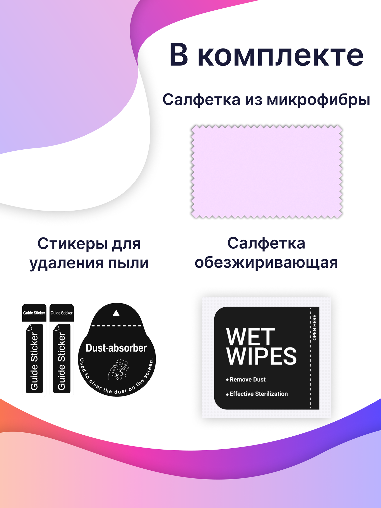 | Подробная комплектация | В комплект входят: стикеры для удаления пыли - 1 шт.; влажная салфетка - 1 шт.; сухая салфетка - 1 шт. |