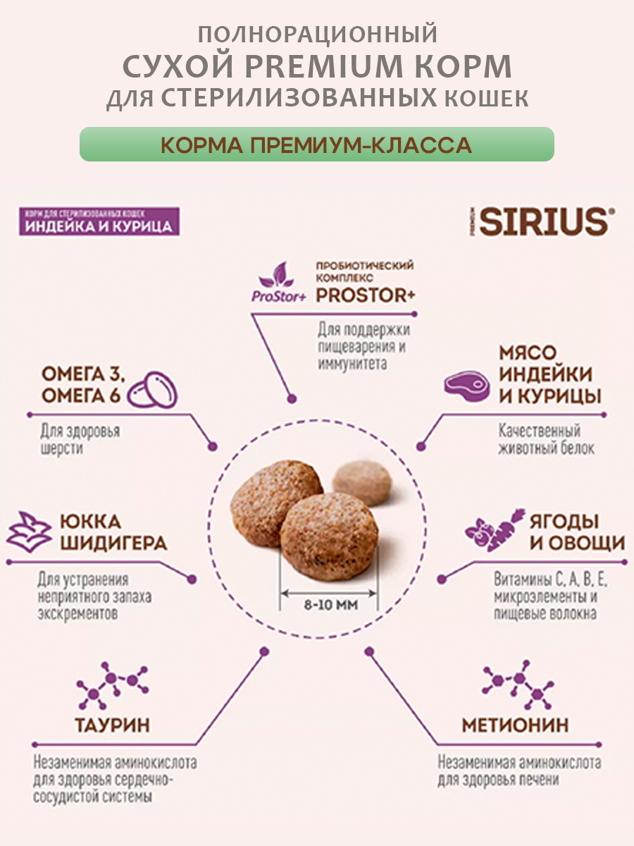 SIRIUS/Полнорационный сухой PREMIUM корм для стерилизованных кошек, Индейка и курица, 0.4 кг