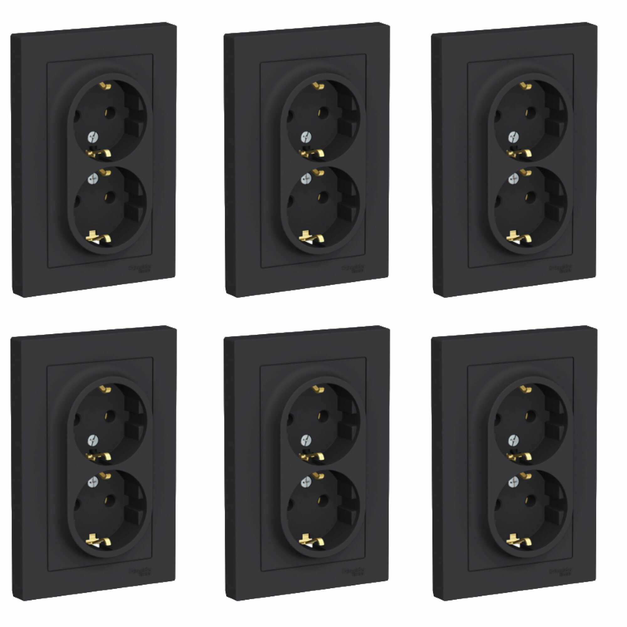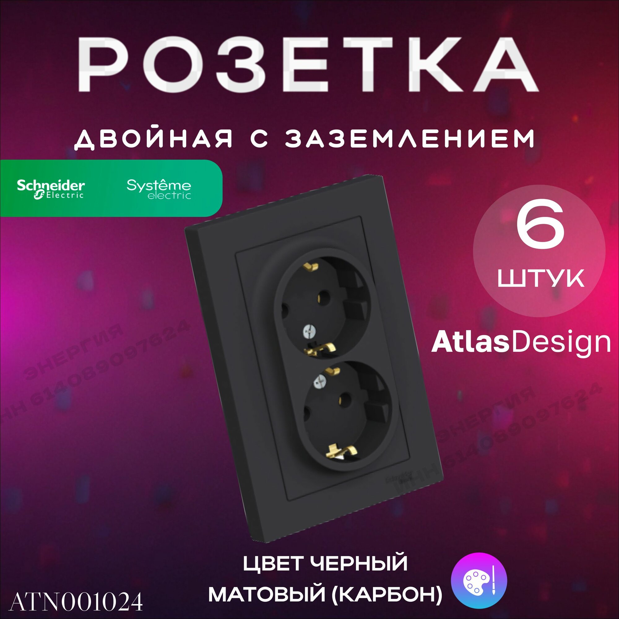 6 шт. Systeme Electric AtlasDesign Карбон Розетка с заземлением двойная, 16А, в сборе, ATN001024