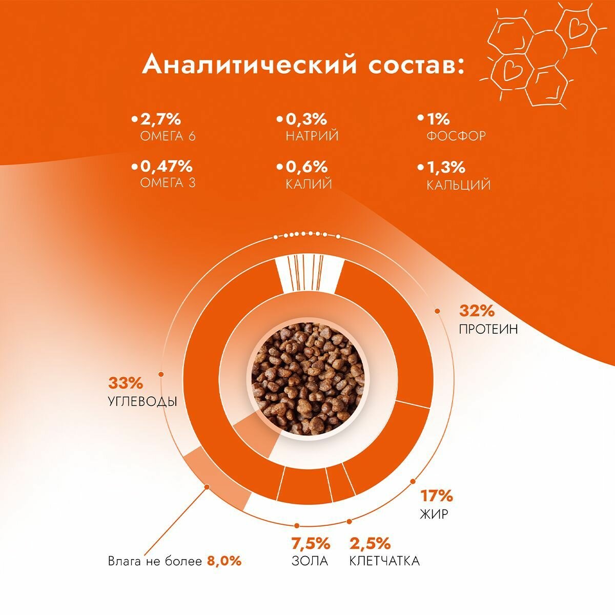 | Пищевая ценность | сырой протеин 32,0%, сырой жир 17,0%, сырая клетчатка 2,5%, сырая зола 7,5%, углеводы 33,0%, кальций 1,3%, фосфор 1,0-1,1%, натрий 0,3%, калий 0,6%, лизин 3,0%, метионин+цистин 1,0%, триптофан 0,2% омега-3 жирные кислоты 0,47%, омега-6 жирные кислоты 2,7%, влага не более 8,0% |