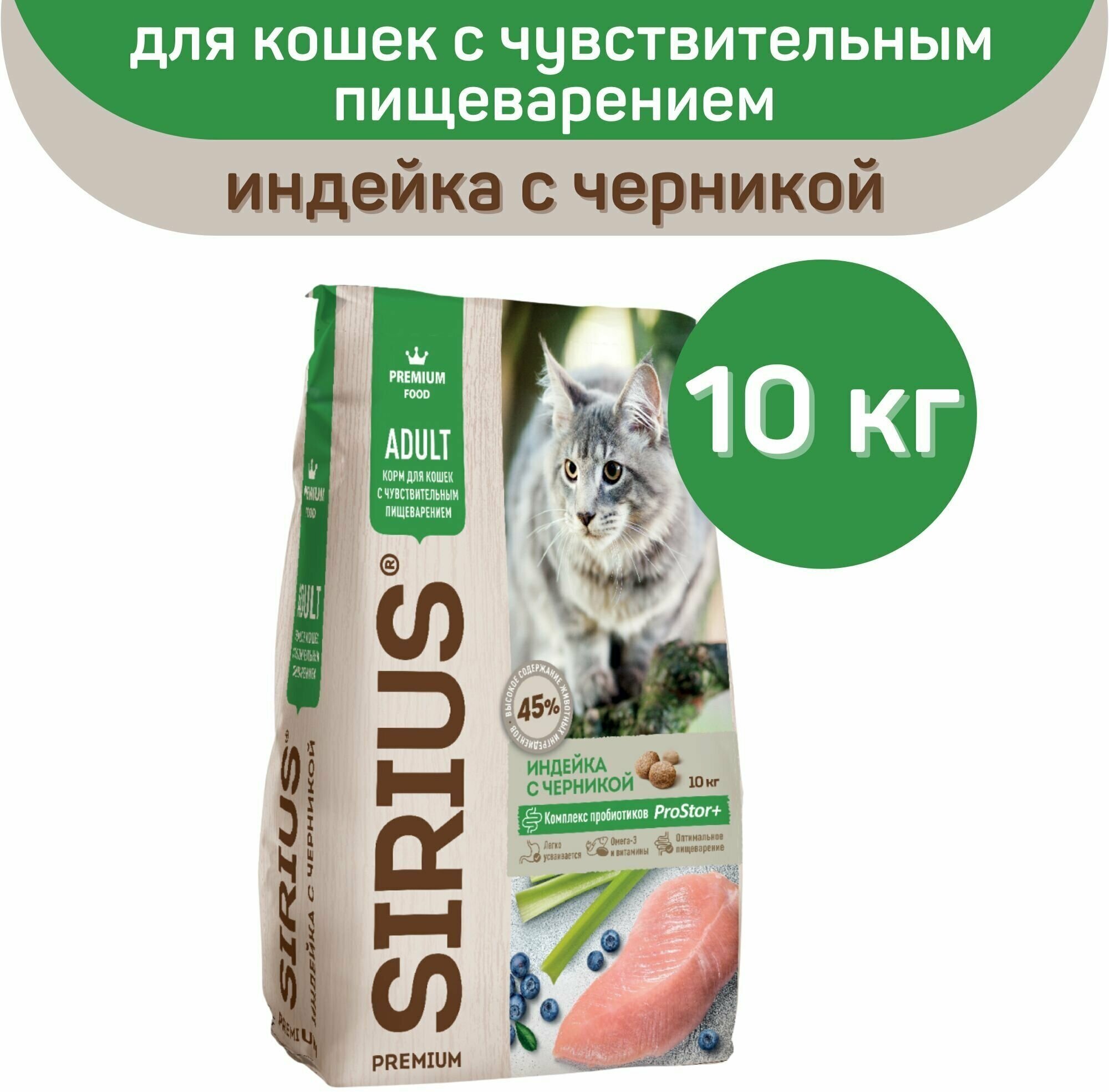 SIRIUS Сухой корм взрослых кошек с чувствительным пищеварением Индейка черника 10 кг