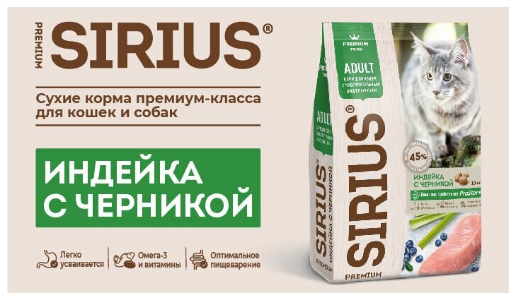 SIRIUS для взрослых кошек с чувствительным пищеварением с индейкой и черникой (1,5 + 1,5 кг)