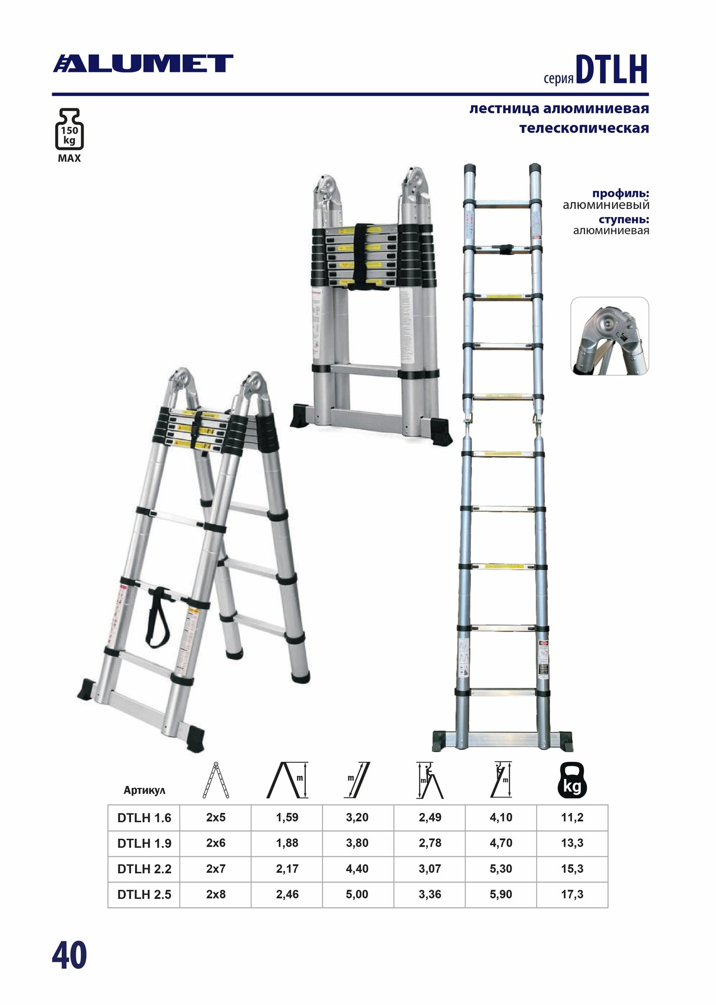 Лестница телескопическая алюмет DTLH1.6 двухсторонняя с шарниром 1,6 1,6 м