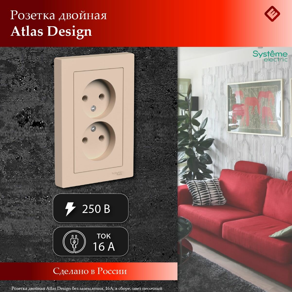 Купить Systeme Electric AtlasDesign Песочный Розетка двойная без заземления,16А, в сборе с рамкой ATN001220