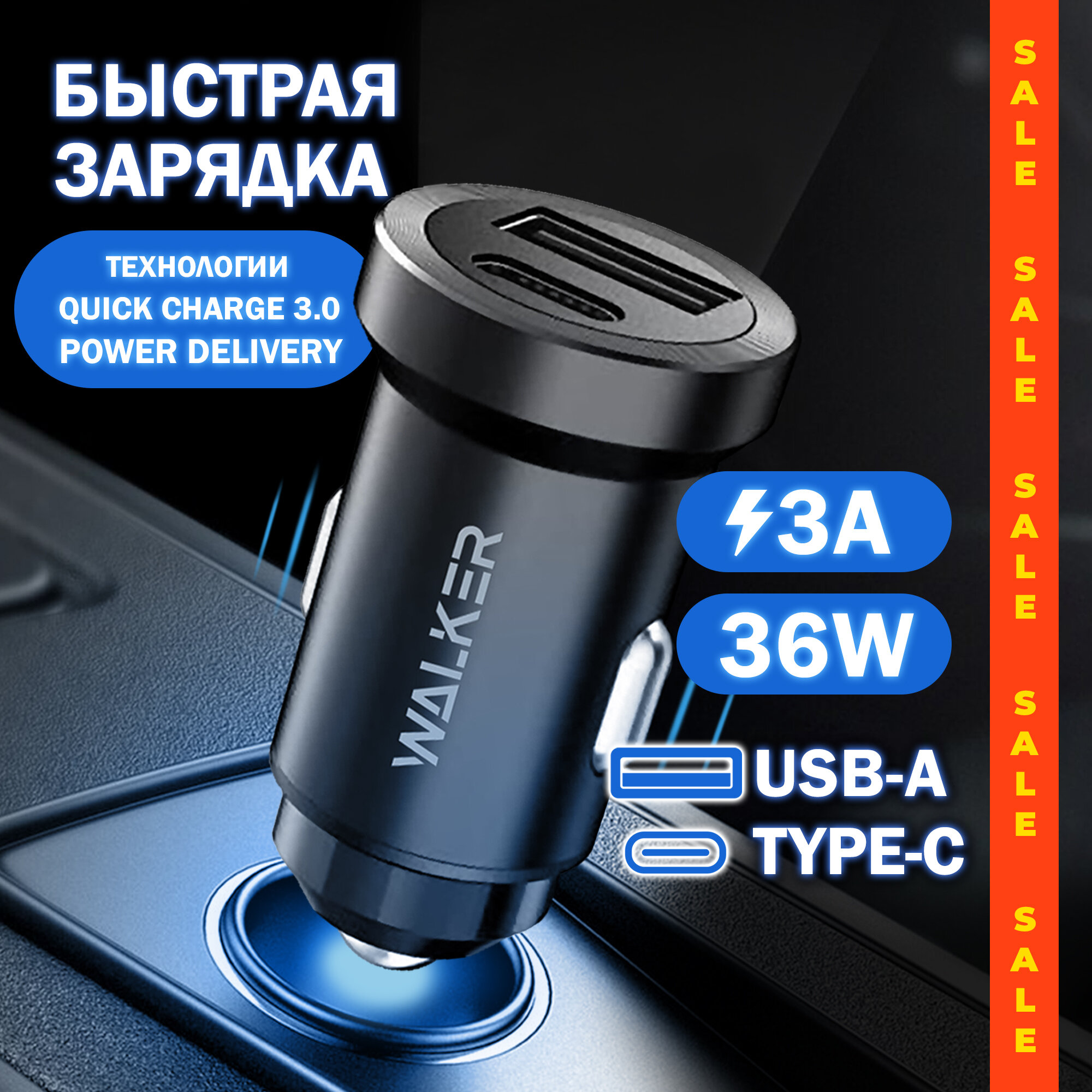 Автомобильная зарядка для айфона, WALKER, WCR-25, с быстрым зарядом, USB+TypeC разъемы, 36W, зарядное устройство на телефон samsung, черная