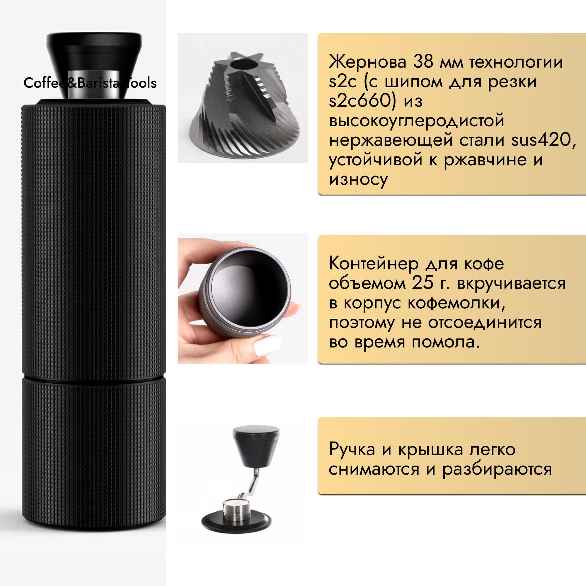| Дополнительная информация | емкость на 25 г; длина ручки 159 мм; система регулировки помола: эспрессо – 6-12 щелчков, аеропресс – 12-15 щелчков, пуровер 15-24 щелчка, фреч-пресс – 24-27 щелчков |
