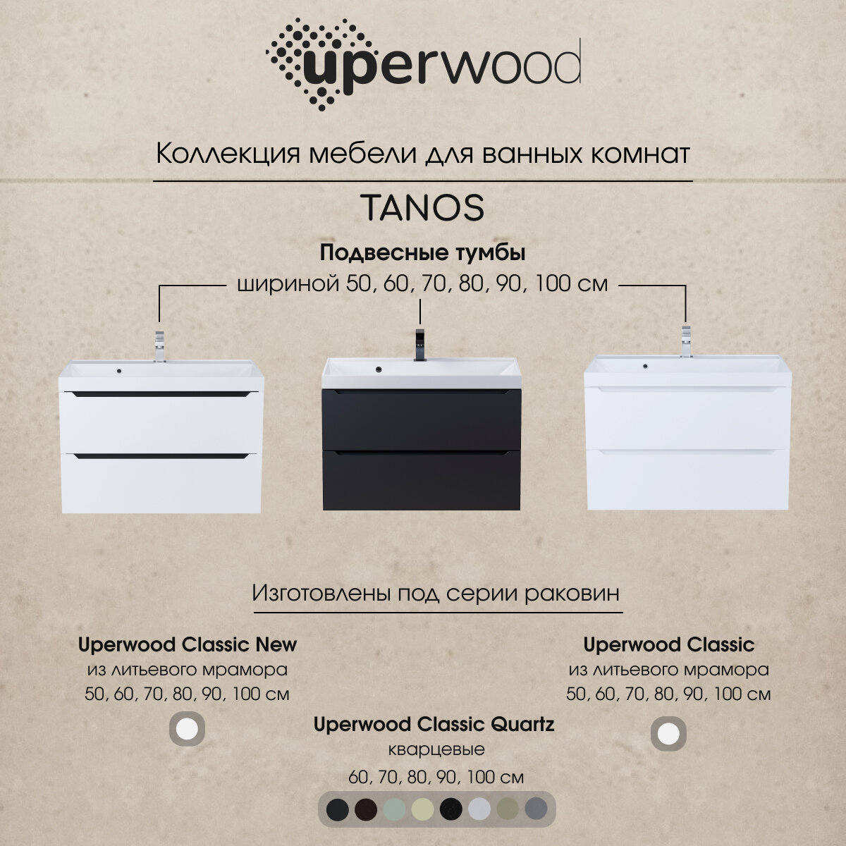 | Дополнительная информация | Для тумбы подходит раковина Andrea Classic 90 см (арт. 4680028070115). Также комплект из тумбы с раковиной Tanos можно дополнить подходящим по размеру зеркалом с подсветкой Uperwood Tanos шириной 90 см (арт. 291020223) и подвесным шкафом-пеналом Tanos белого цвета (арт. 291020249). |