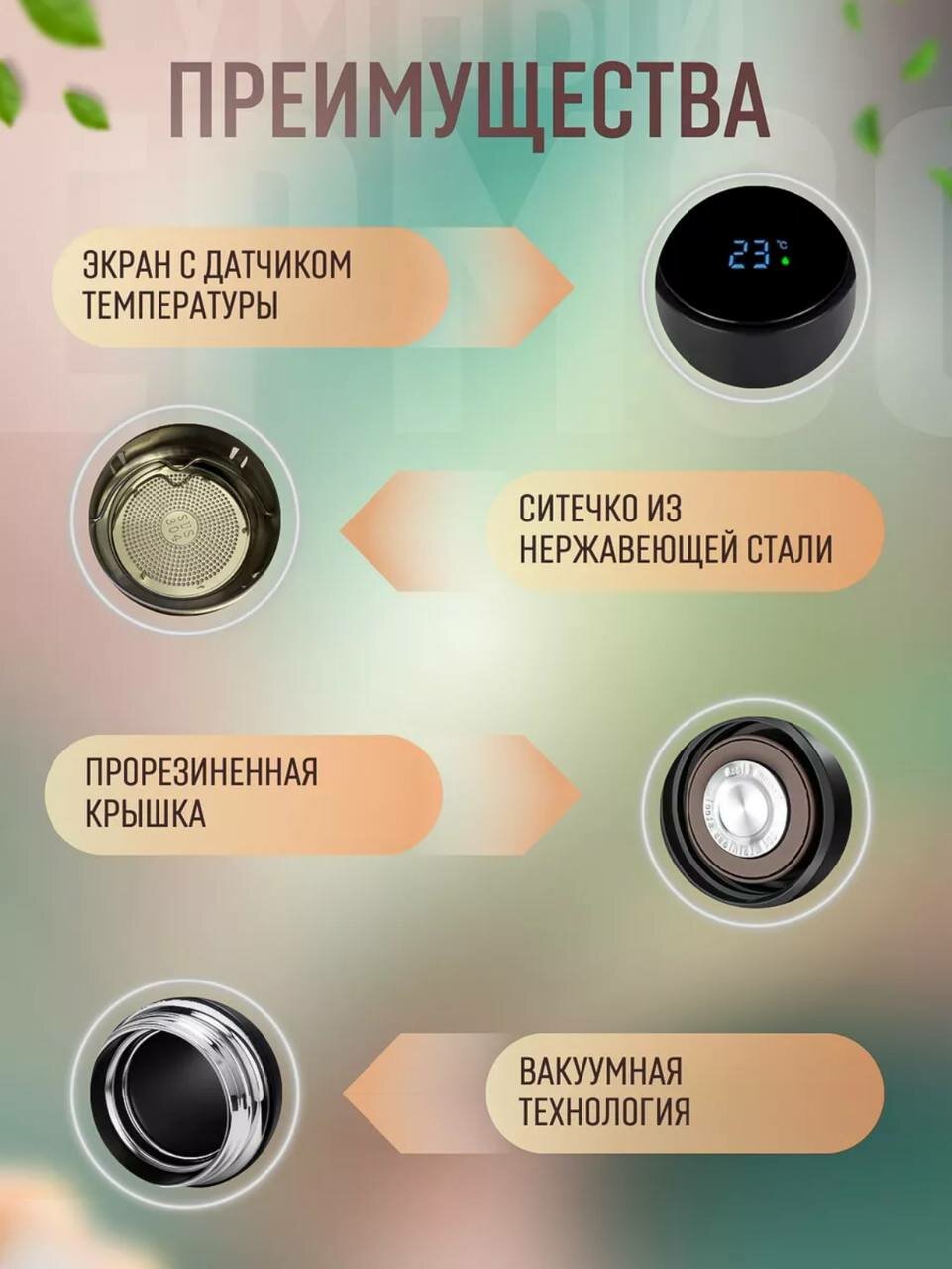 | Отзыв: | Купил для жены. Она пьёт тёплую воду. Ей понравилось, что всегда знает температуру в термосе. |