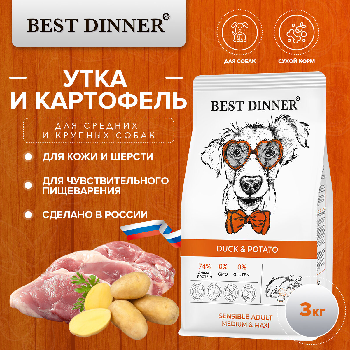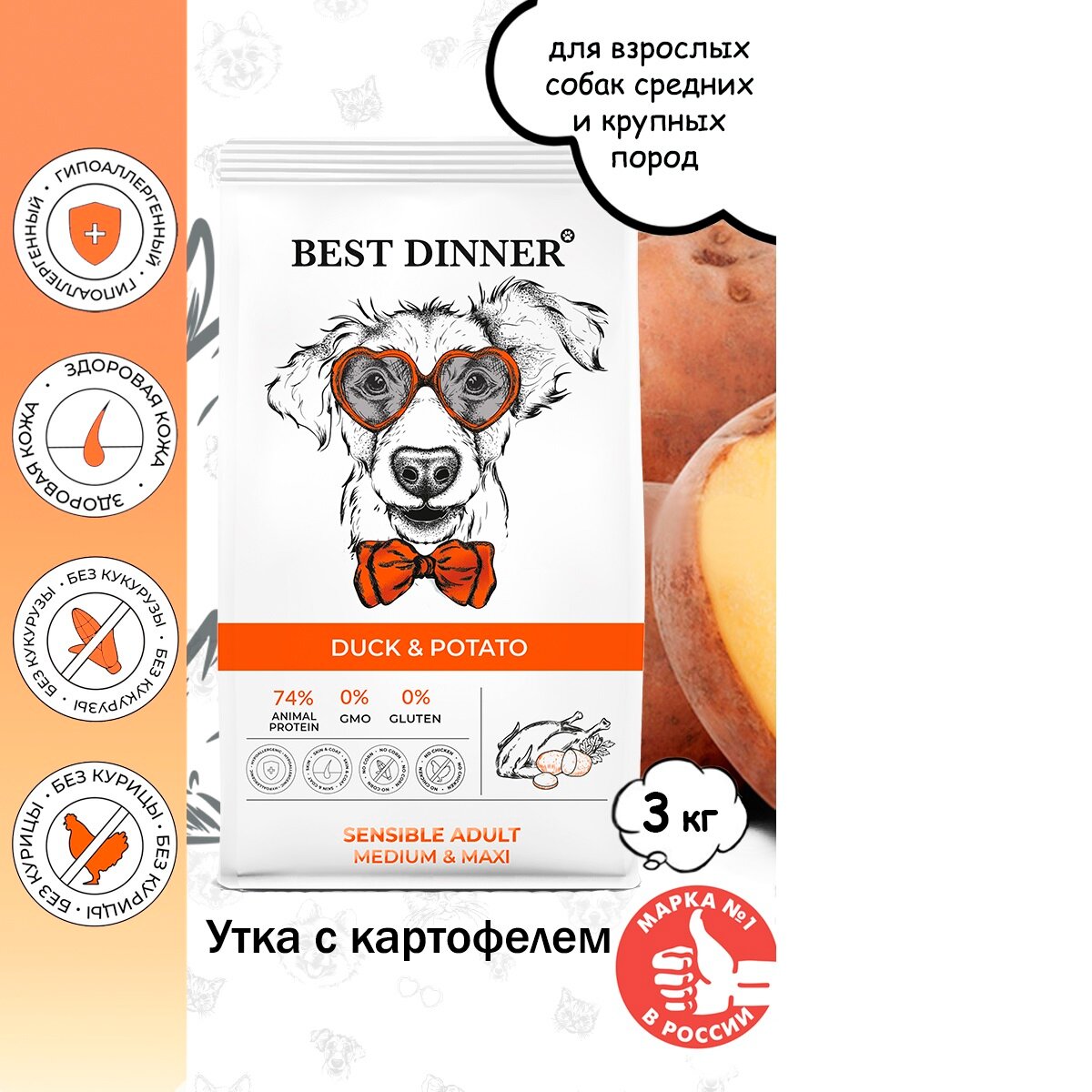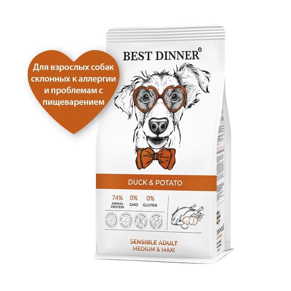 BEST DINNER 3кг корм сухой для собак Adult sensible Medium&Maxi склонные к аллерг. и чувствит. пищевар. утка с картошкой