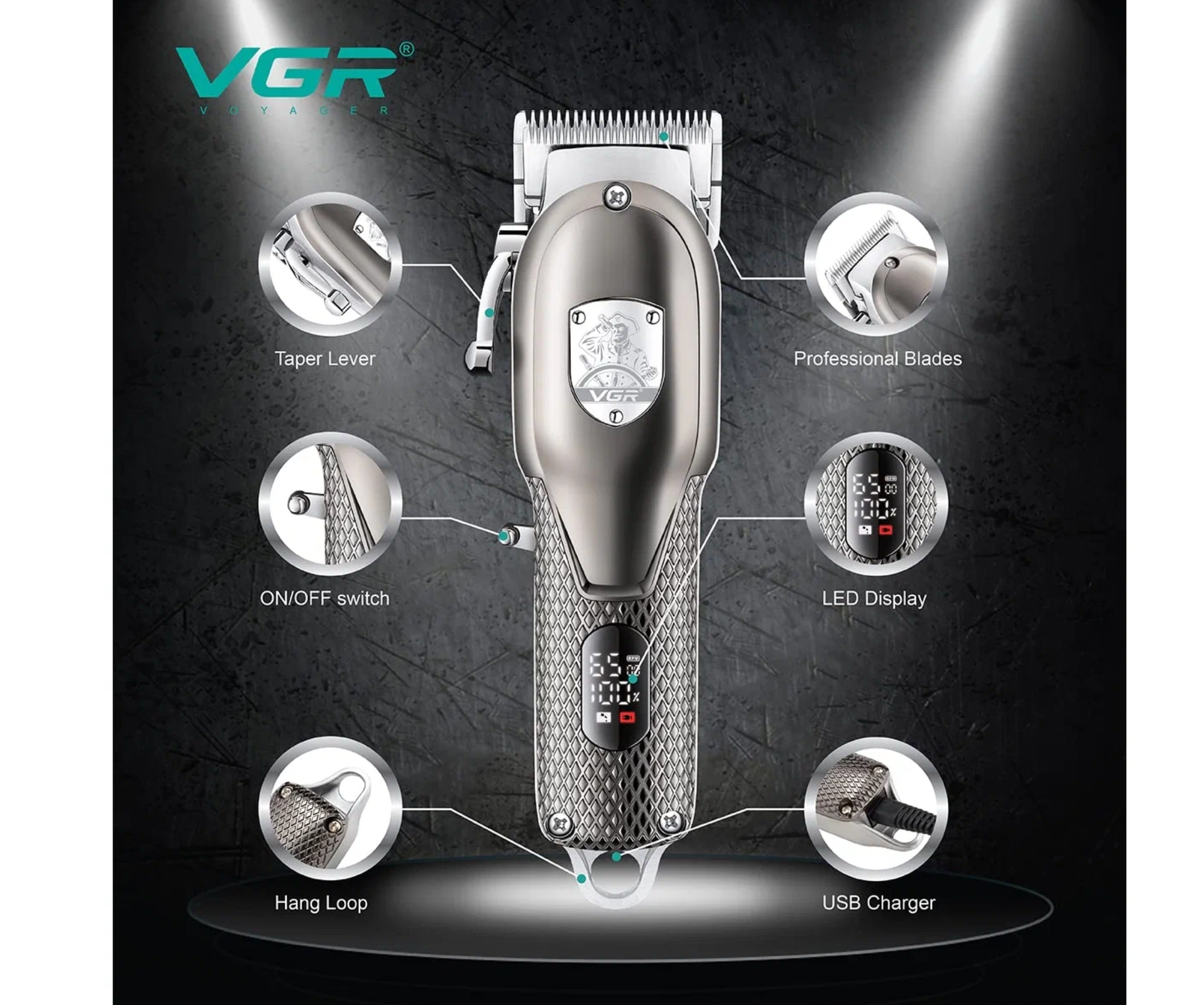 Машинка для стрижки волос и бороды VGR V-671, беспроводная, LED-дисплей, черная