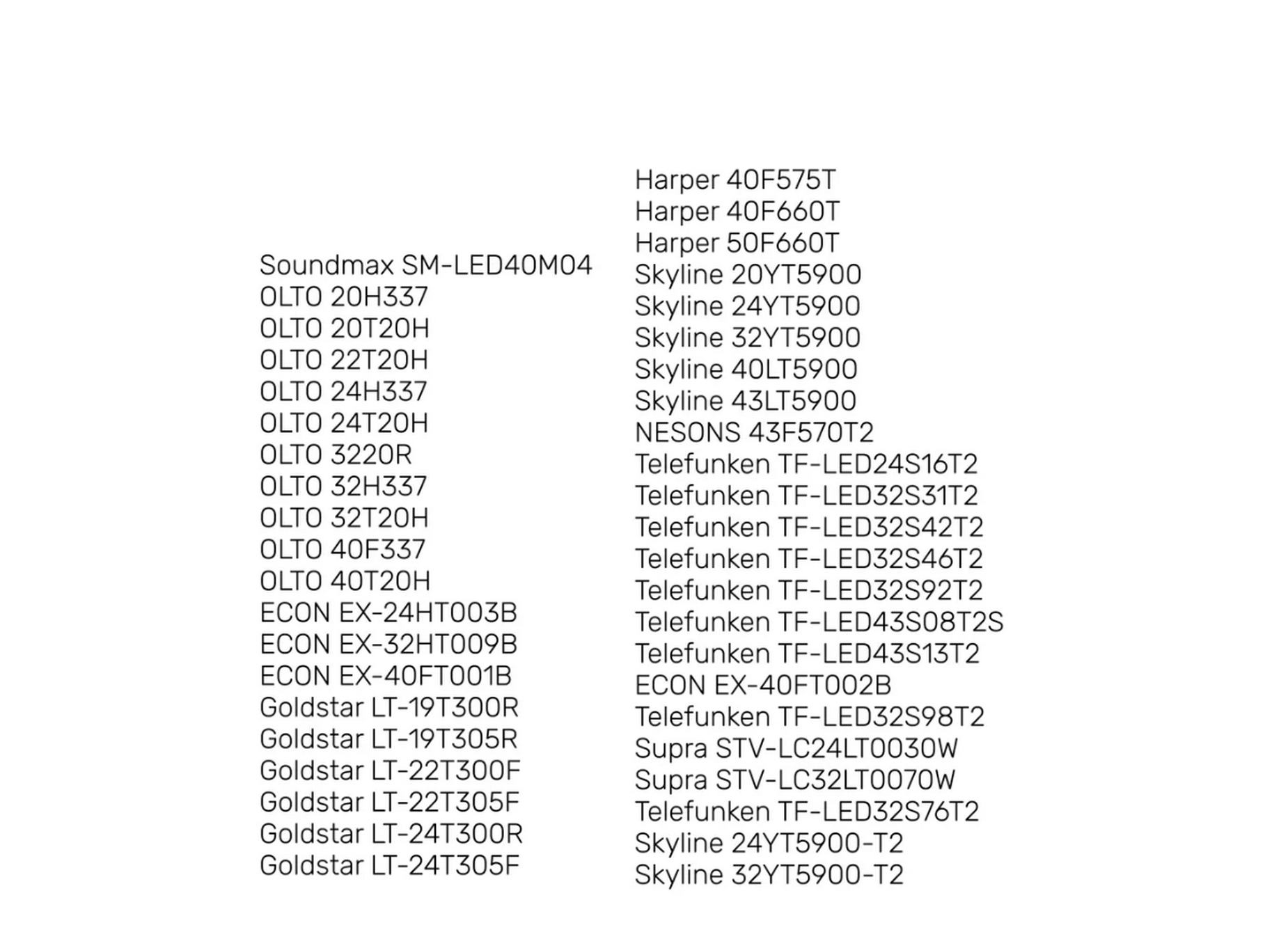 | Назначение | Supra STV-LC19T410WL, Supra STV-LC22T410FL, Supra STV-LC22T410WL, Supra STV-LC24LT0060W, Supra STV-LC24LT0065W, Supra STV-LC24T410FL, Supra STV-LC24T410WL, Supra STV-LC32LT0065W, Supra STV-LC32LT0090W, Supra STV-LC32T500WL, Supra STV-LC32T900WL, Supra STV-LC40LT0060F, Supra STV-LC40LT0065F, Supra STV-LC40ST0065F, Supra STV-LC40T900FL, Supra STV-LC40T900WL, Supra STV-LC42T900FL |