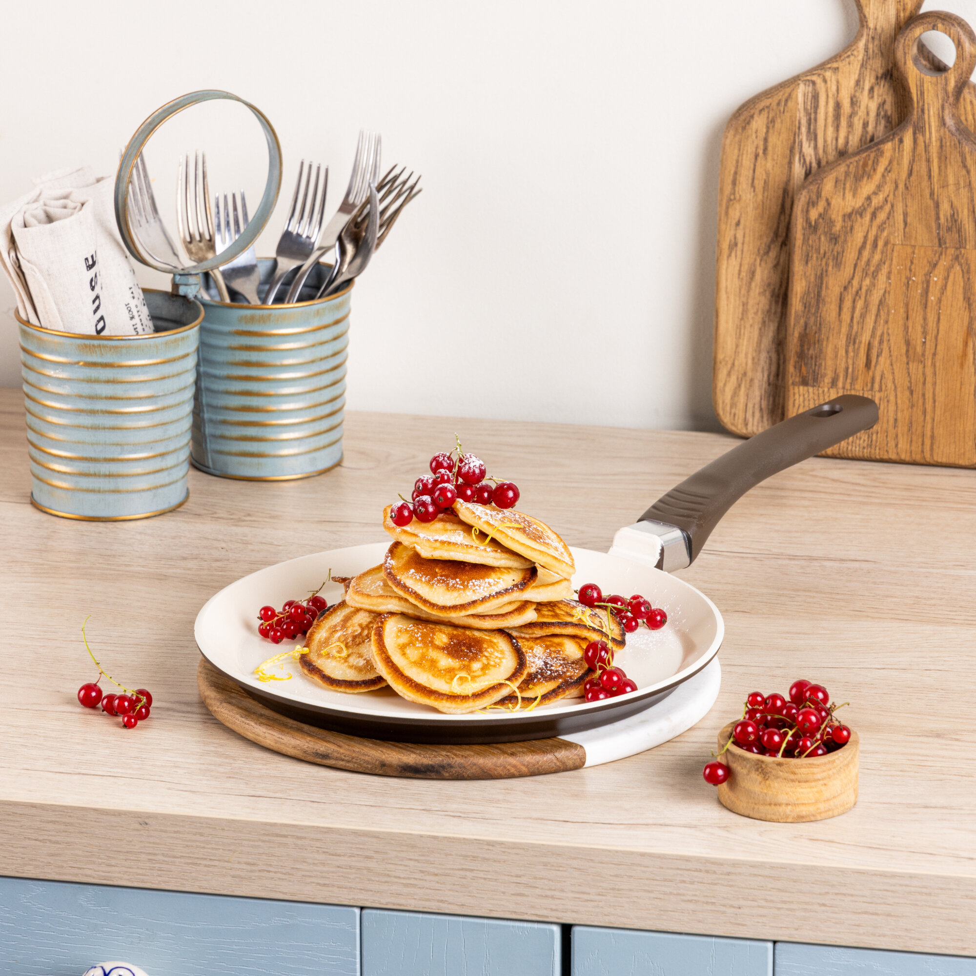 Поверхность хоть и заметно прочнее, чем у традиционных антипригарных покрытий, но использовать металлическую лопатку не стоит - царапины будут появляться, а с потерей гладкости и блины станут сниматься хуже. |