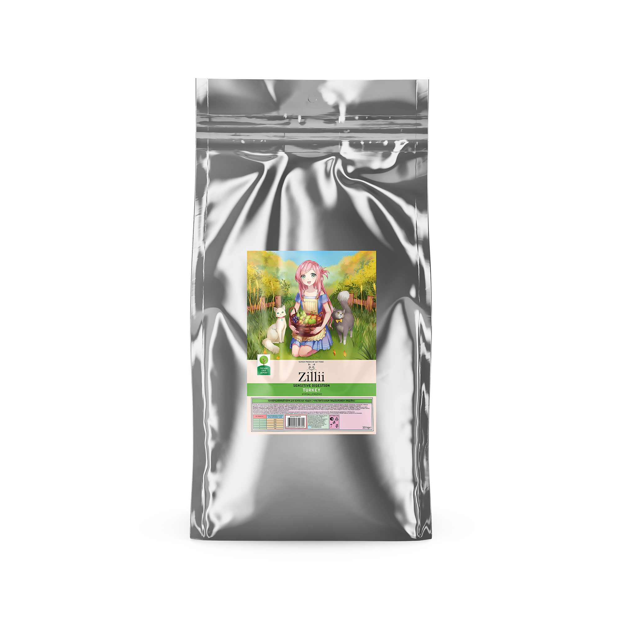 Корм сухой для кошек с чувствительным пищеварением 10 кг, гипоаллергенный ZILLII (Зилли), Индейка