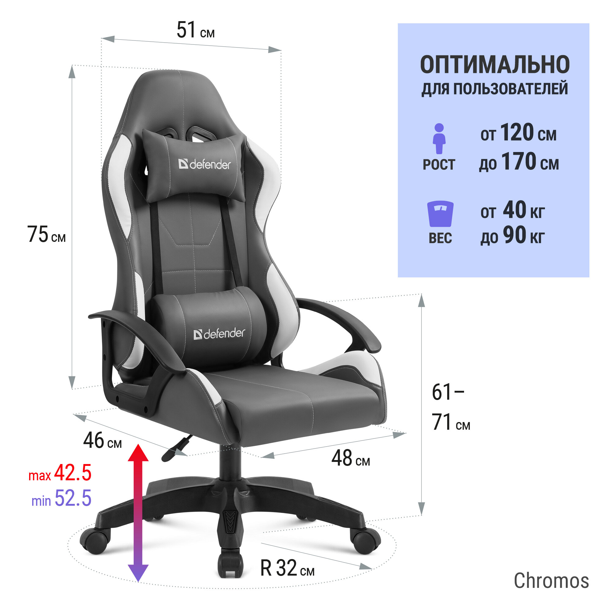 Купить Кресло компьютерное, игровое Defender Chromos черный/белый, 2 подушки