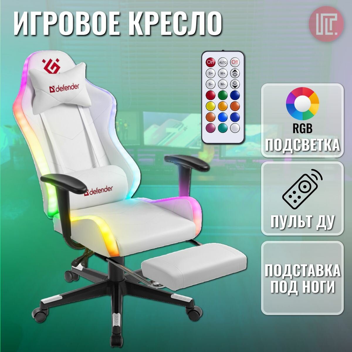 Игровое кресло / компьютерное кресло Defender Watcher белый, RGB подсветка + пульт, полиуретан, 2 подушки и подставка для ног