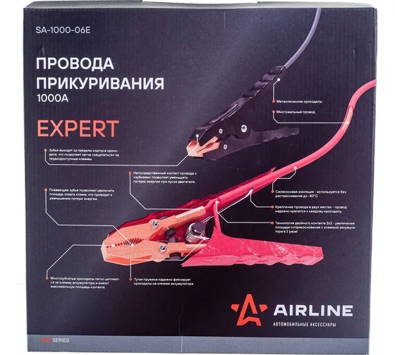 | Дополнительная информация | Провода прикуривания AIRLINE EXPERT разработаны инженерами нашей компании и предназначены для запуска двигателей легковых и грузовых автомобилей, а также спецтранспорта с разряженной аккумуляторной батареей. Многожильный провод длиной 5 м позволяет использовать провода для любого коммерческого транспорта, а "плавающие крокодилы" с максимальной площадью "зубов" и технологией двойного контакта 2х2 позволят передать энергию с минимальными потерями. Преимущества проводов прикуривания 1000 А : 1. Плавающие крокодилы - позволяют максимально плотно охватить любую клемму аккумулятора или любую металлическую поверхность. 2. Максимальная площадь контакта – крокодил контактирует с клеммой АКБ всей поверхностью, а не только 'зубами' 3. Технология двойного контакта 2х2. |