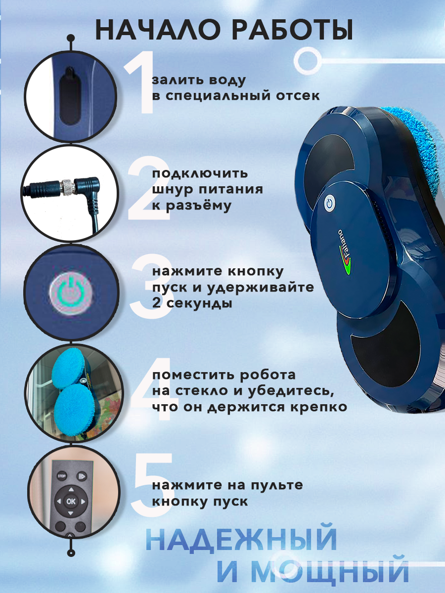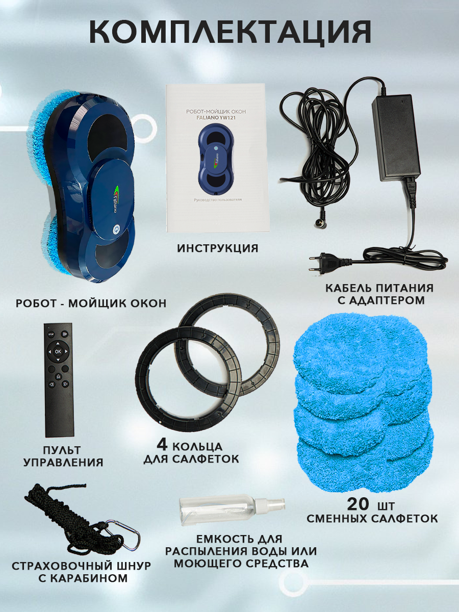 Робот мойщик окон Faliano синий с распылителем воды, 20 салфеток в комплекте интересное: