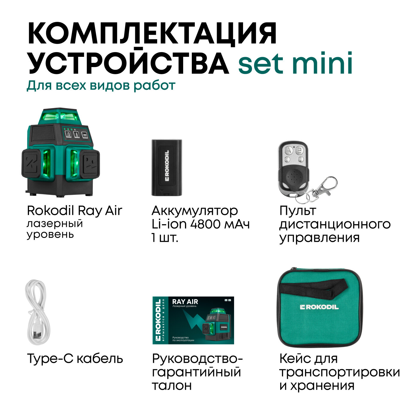 Купить Лазерный уровень 3D Rokodil Ray Air (set мини), нивелир лазерный самовыравнивающийся, зеленый луч, 12 линий на 360 градусов, строительный инструмент