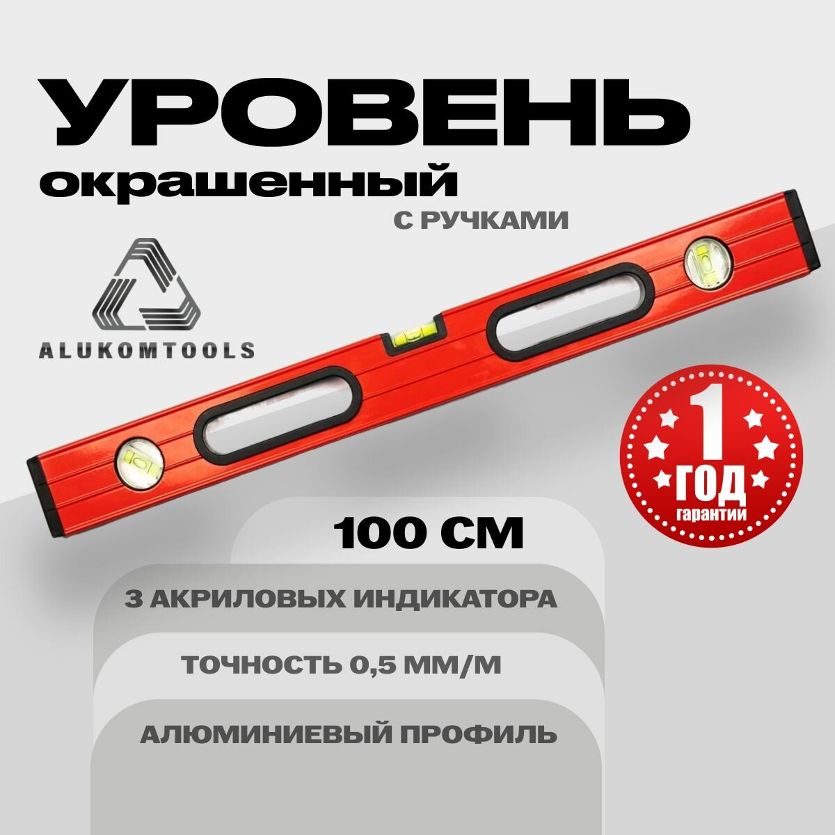 Уровень окрашенный 100 см"ALUKOMTOOLS" с ручками и акриловыми индикаторами