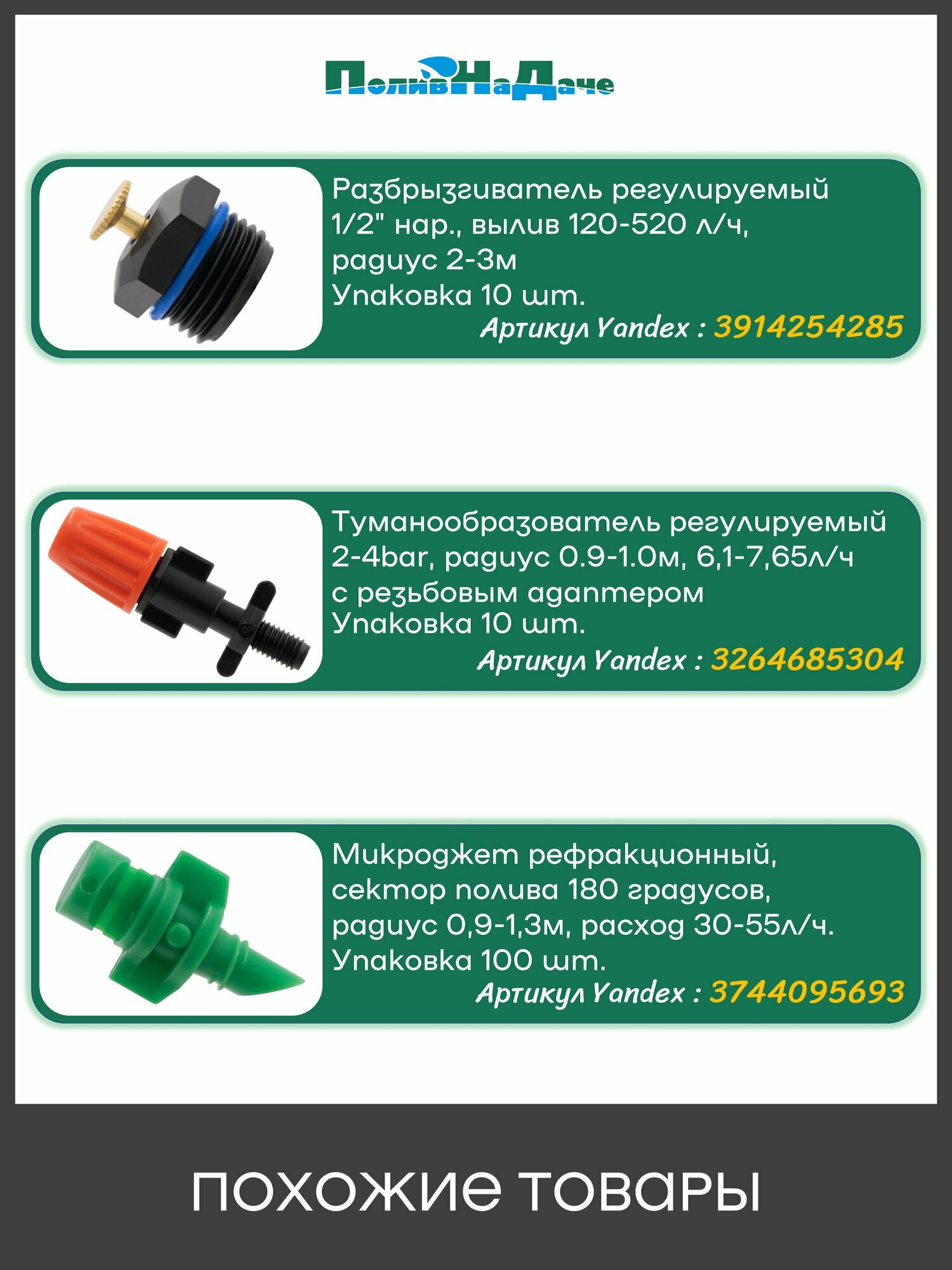 | Комплектация | Разбрызгиватель регулируемый 1/2" нар, вылив 120-520 л/ч, радиус 2-3м |