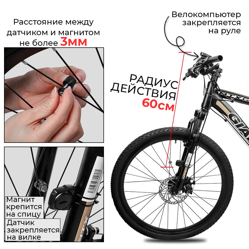 | Функции | максимальная скорость / общее время движения / одометр / секундомер / средняя скорость / счетчик калорий / текущая скорость / термометр / часы |