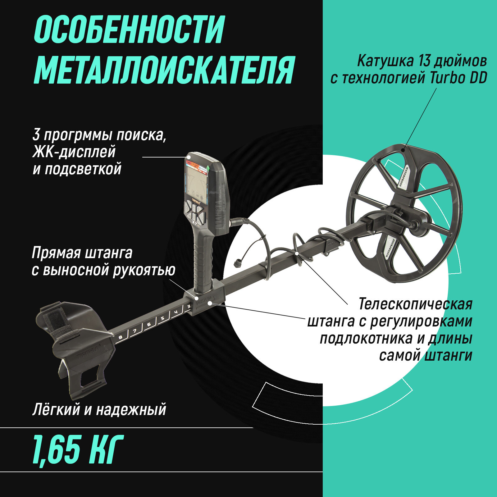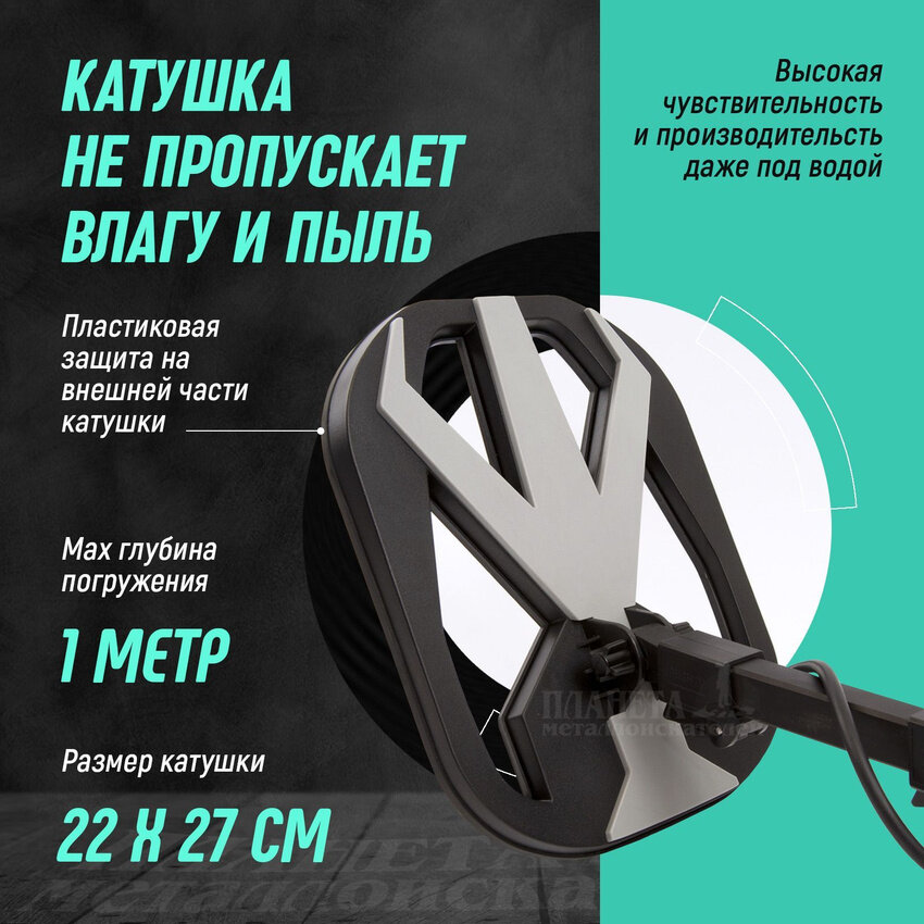 | Особенности | влагозащита катушки/рамки / встроенный динамик / выход на наушники / дискриминатор / настройка чувствительности / подлокотник |