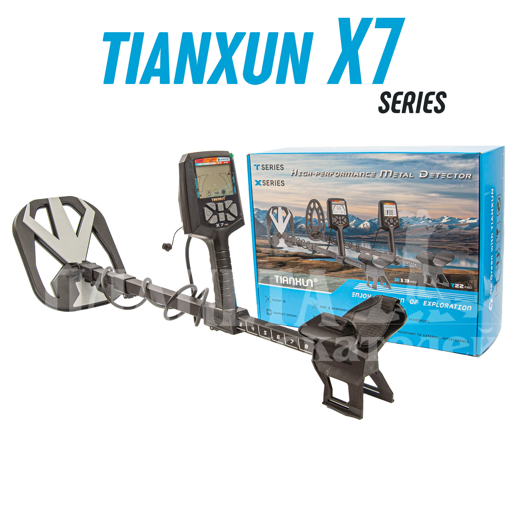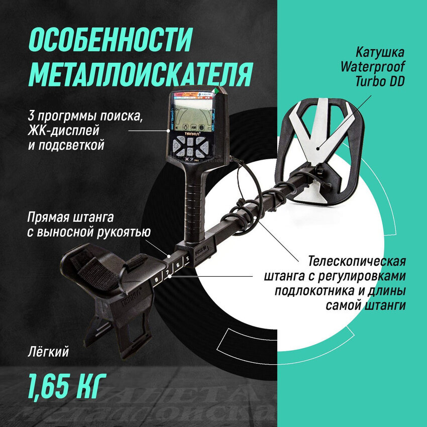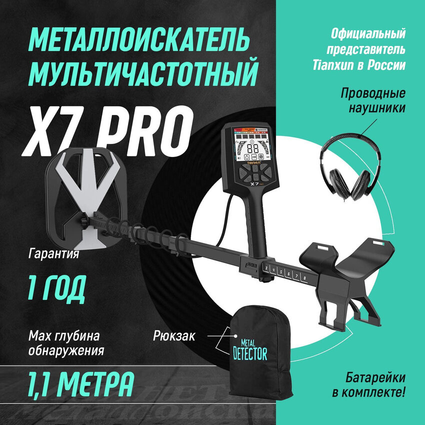 | Комплектация | • Металлоискатель Tianxun X7 PRO Pack с катушкой 13'' • Комплект штанг • Комплект креплений • Поисковая катушка • Наушники • Рюкзак • Фирменная коробка |