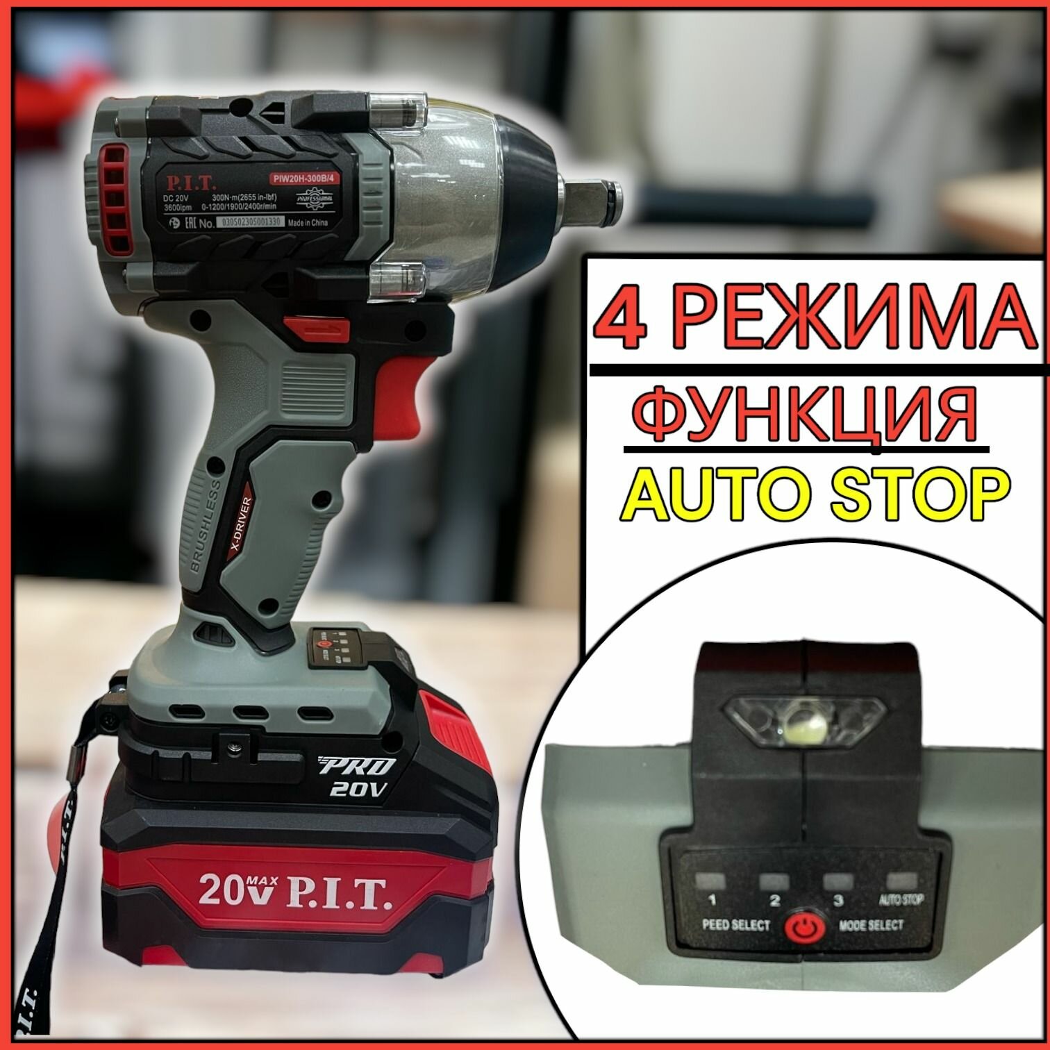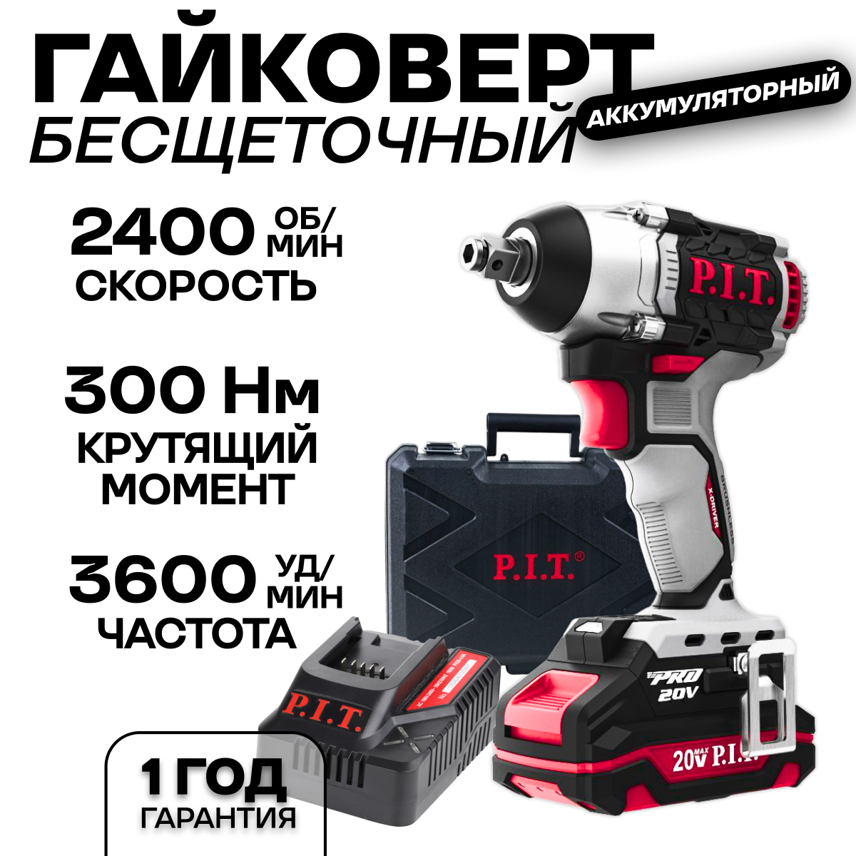 Аккумуляторный гайковерт бесщеточный P.I.T. PIW20H-300B/4, АКБ 4 Ач, З/У
