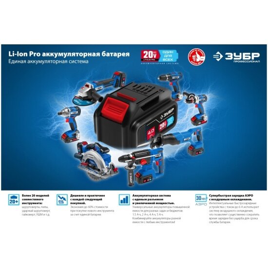 | Аккумуляторная система | ЗУБР 20V MAX Lithium PRO |