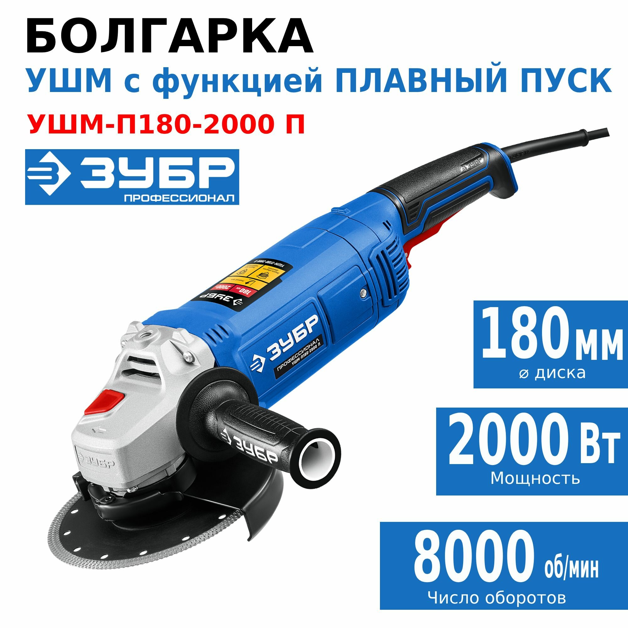 ЗУБР 2000 Вт, d180 мм, УШМ, Профессионал (УШМ-П180-2000 п)